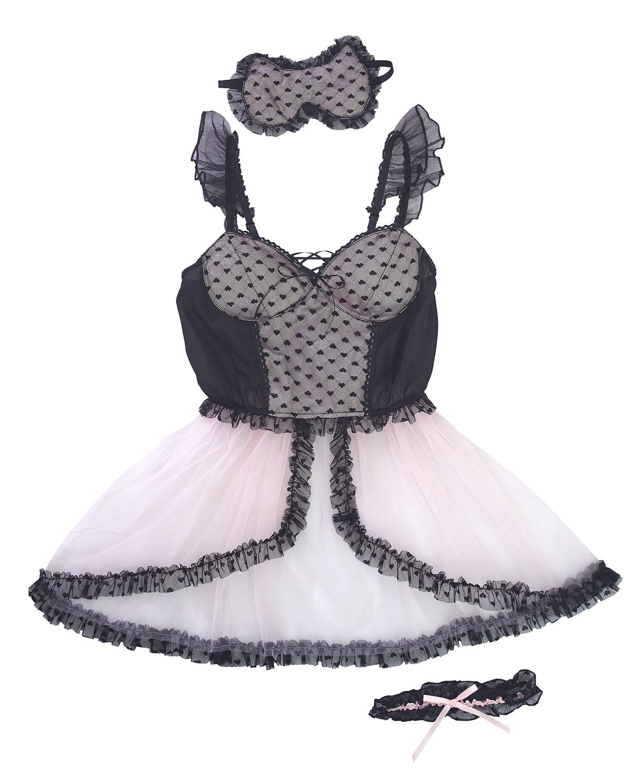 アイマスク&ベビードールの「poppy doll(ポピードール)」シリーズ。あまくてちょっぴりセクシーなベビードールに釘付け…♡ブラックのハート柄チュール生地とベビーピンクの組み合わせで女の子の大好きなカラーリング。 猫耳型のアイマスクが可愛すぎる! アイマスクをヘッドドレス風に使っても可愛い♡ 肩紐調節可能。 背中はシャーリングゴム仕様。 お手持ちのショーツを合わせて、素敵なコーディネートをお楽しみください♪ |