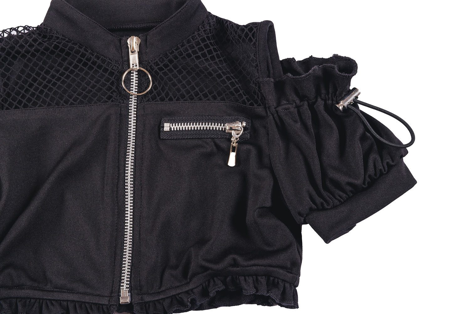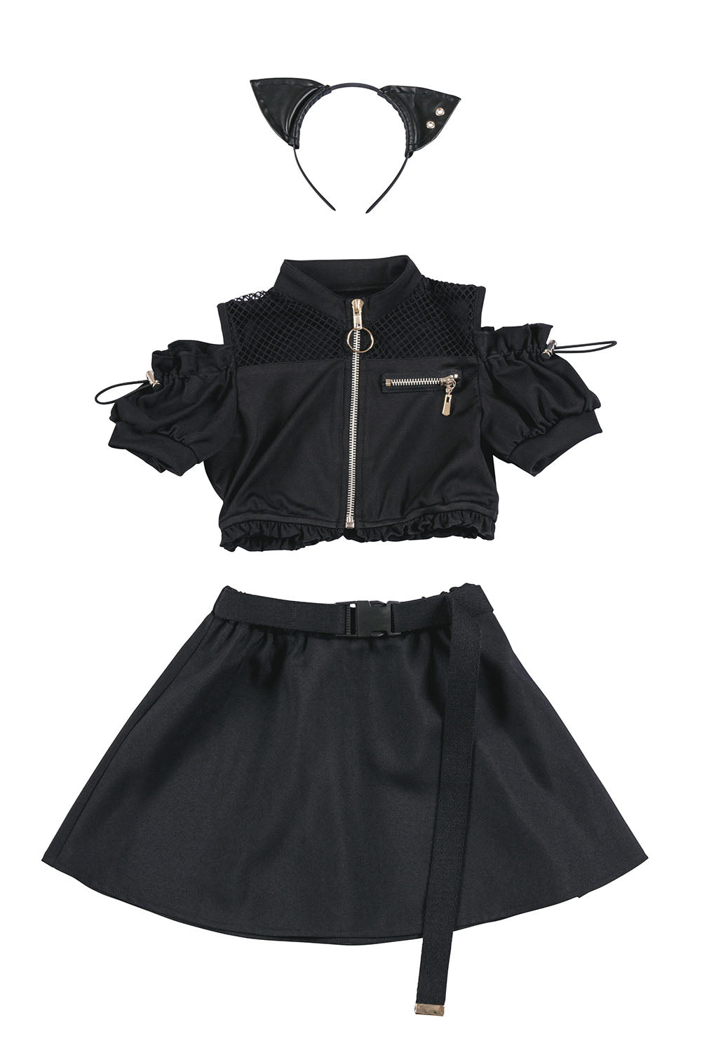 人気要素をMIXしたカジュアルスタイル。 ☆強めでエネルギッシュなイメージ! ・全身ブラック ・合皮カチューシャ ・猫耳にリング状ハトメ ・セパーレートタイプでお腹見せ ☆スポーティー要素も満載! ・メッシュ生地 ・オープンファスナー ・スプリングストッパー ・ガチャベルト 素材はストレッチ生地を使用しアクティブな印象に。 カチューシャは頭が痛くなりにくいよう細めの芯を採用しています♪ |