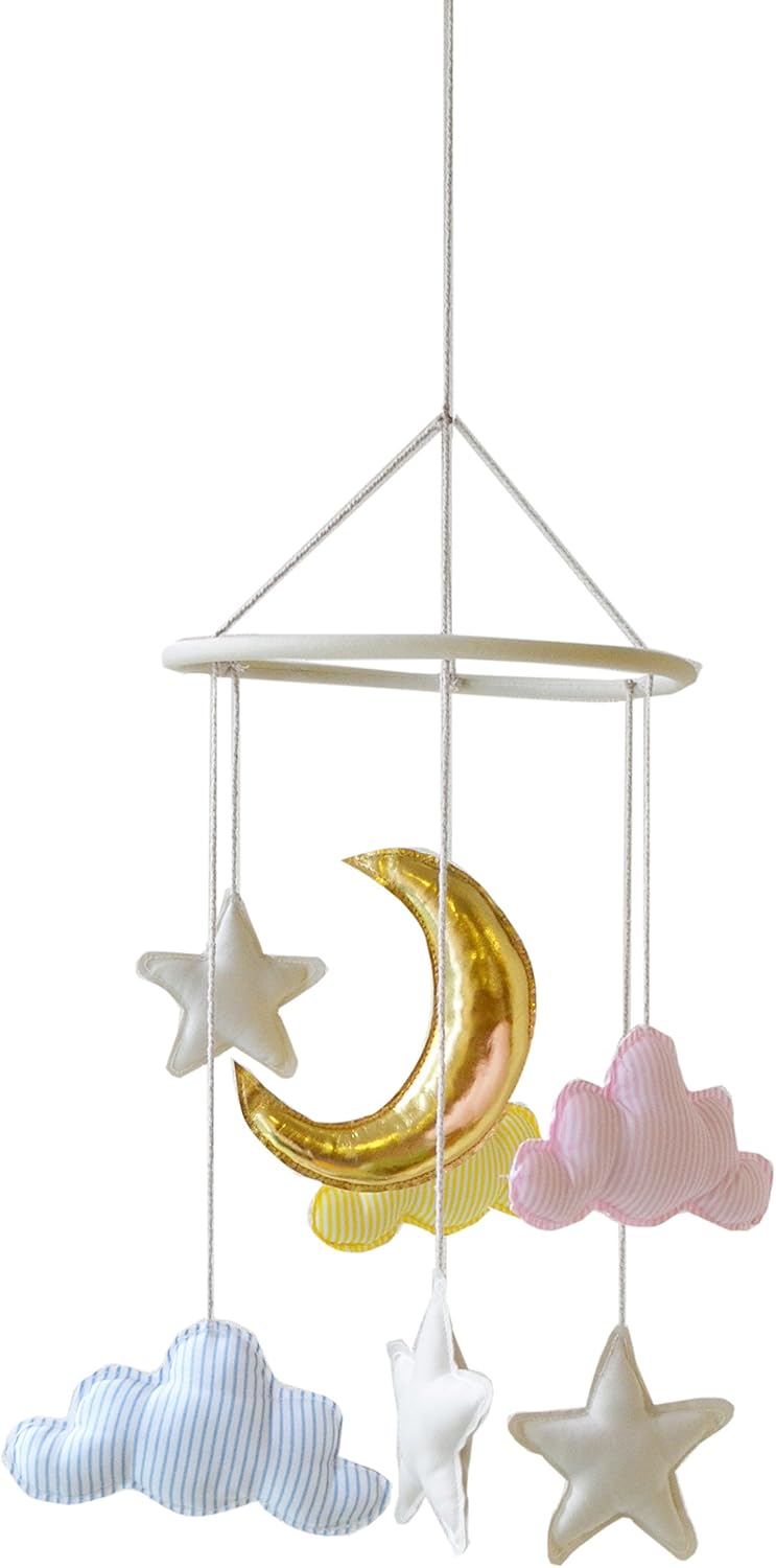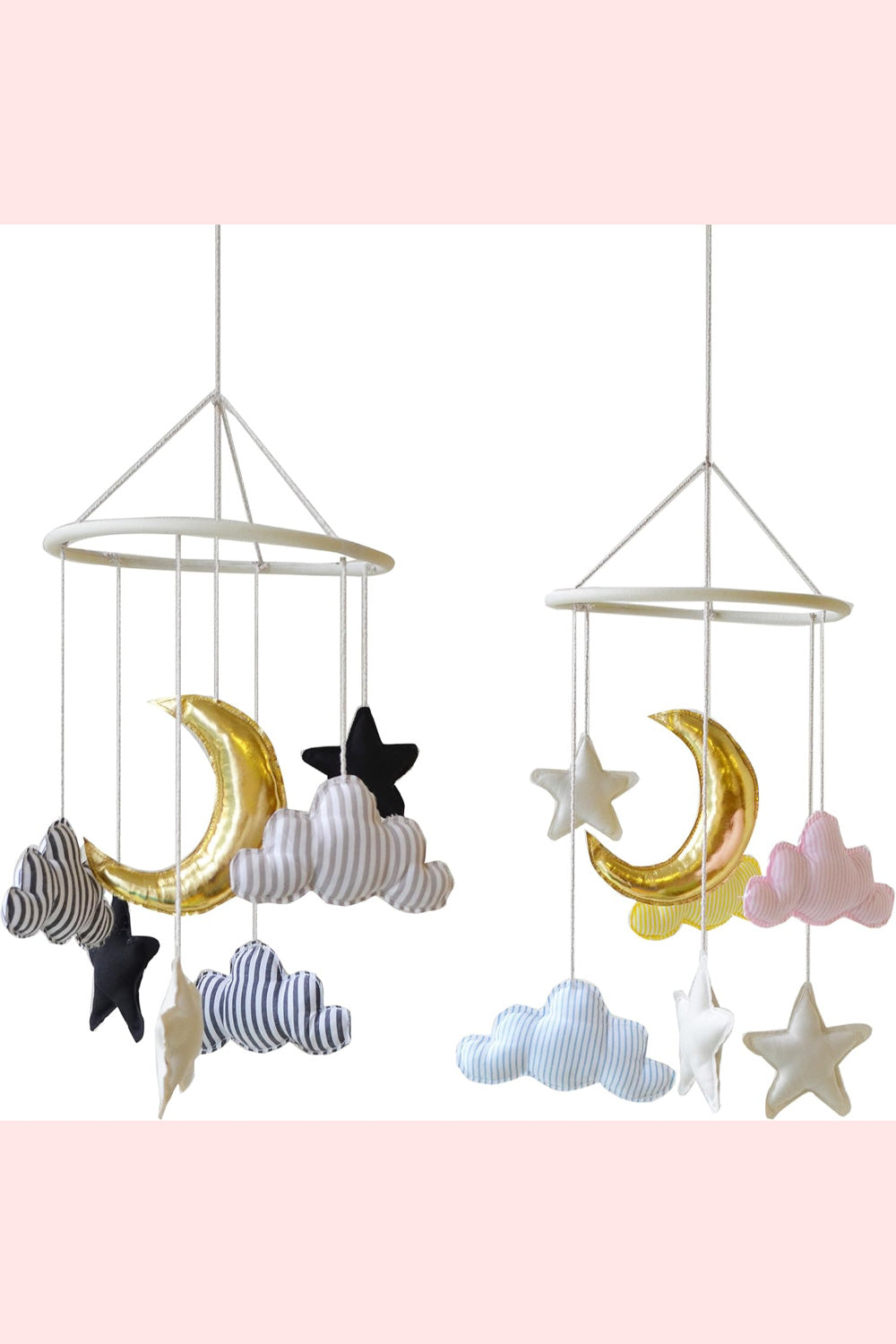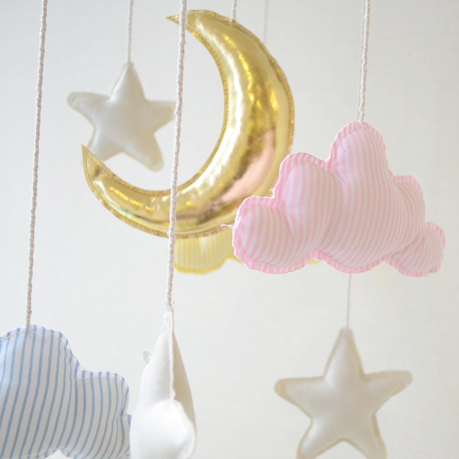 ベビー・キッズのインテリアやパーティーグッズとして人気のかわいらしいパステル系でコーディネートした月と星と雲モチーフのモビールです。