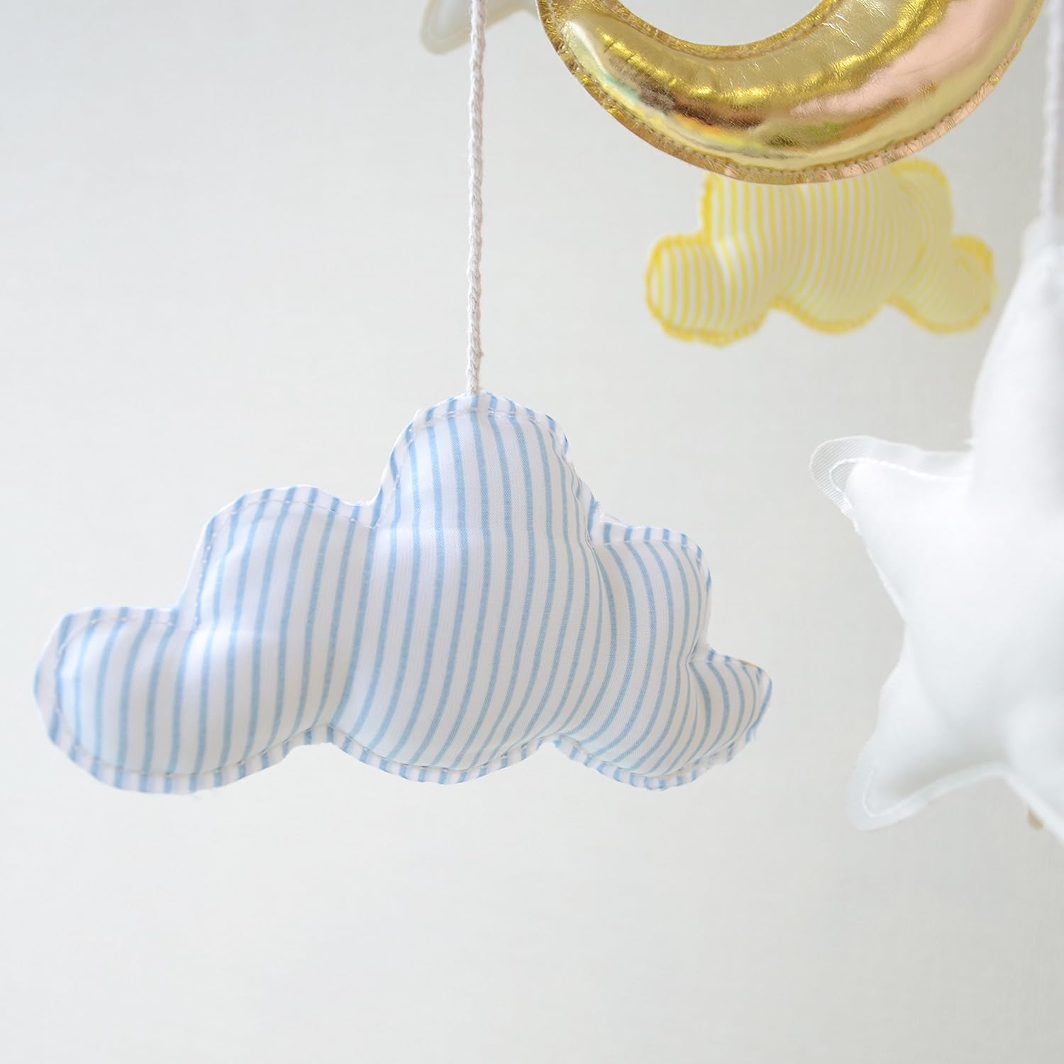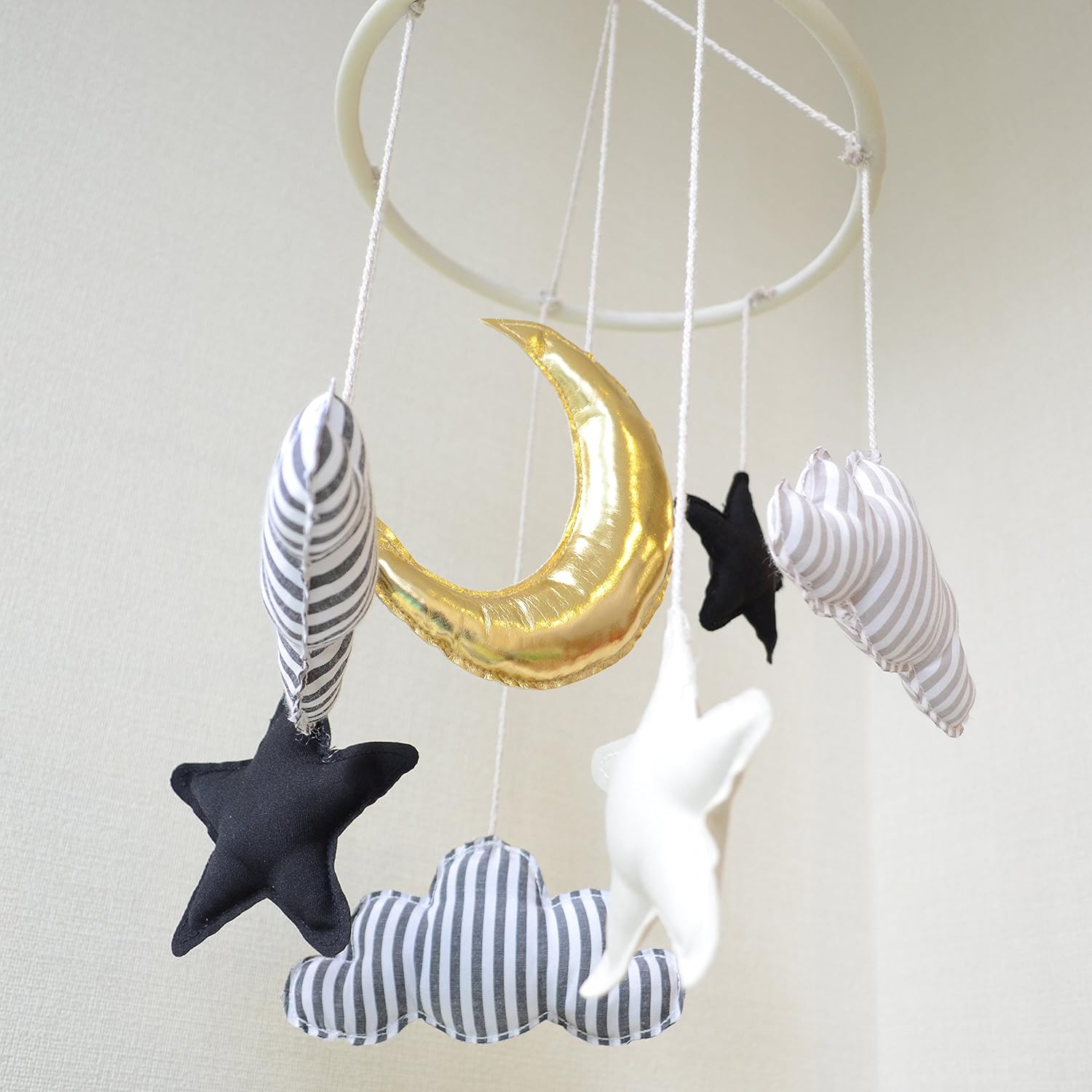 スタイリッシュなモノトーン系ストライプでコーディネートした月と星と雲モチーフのモビールです。