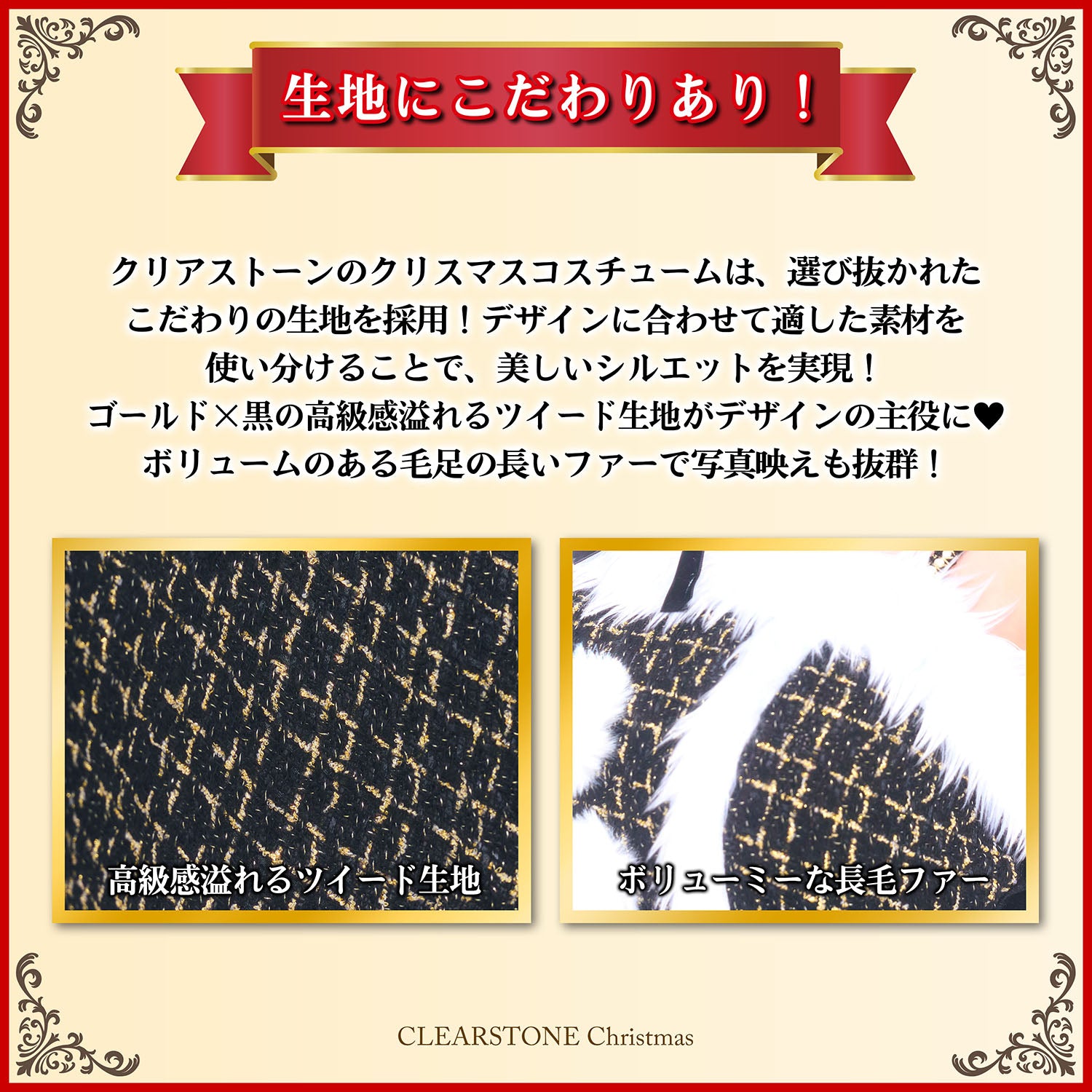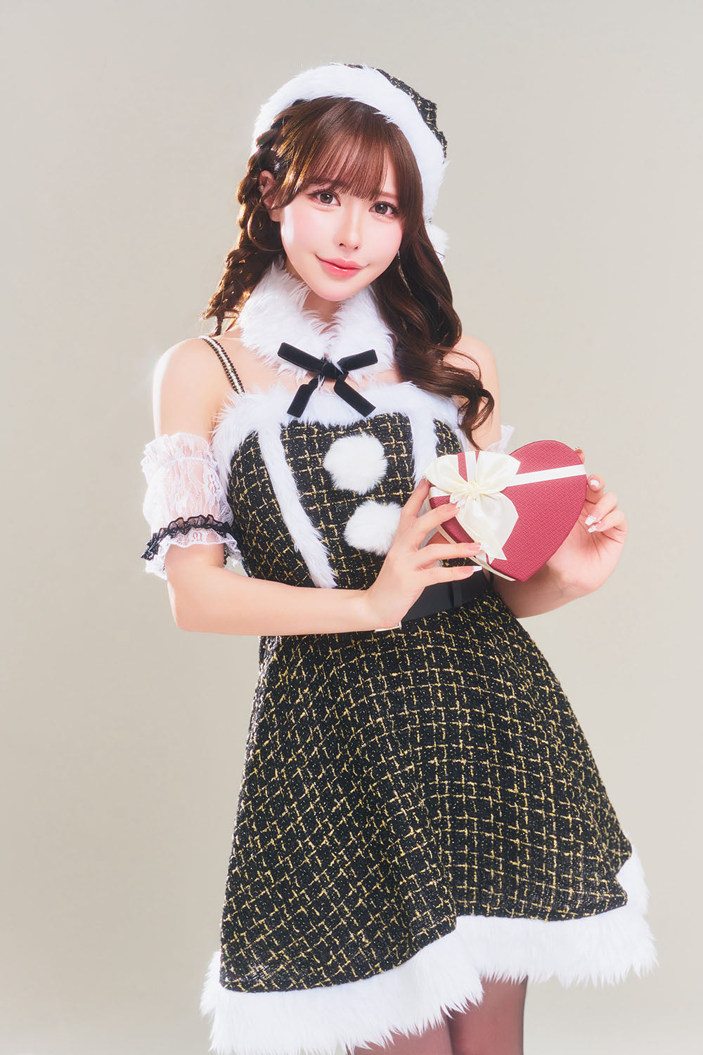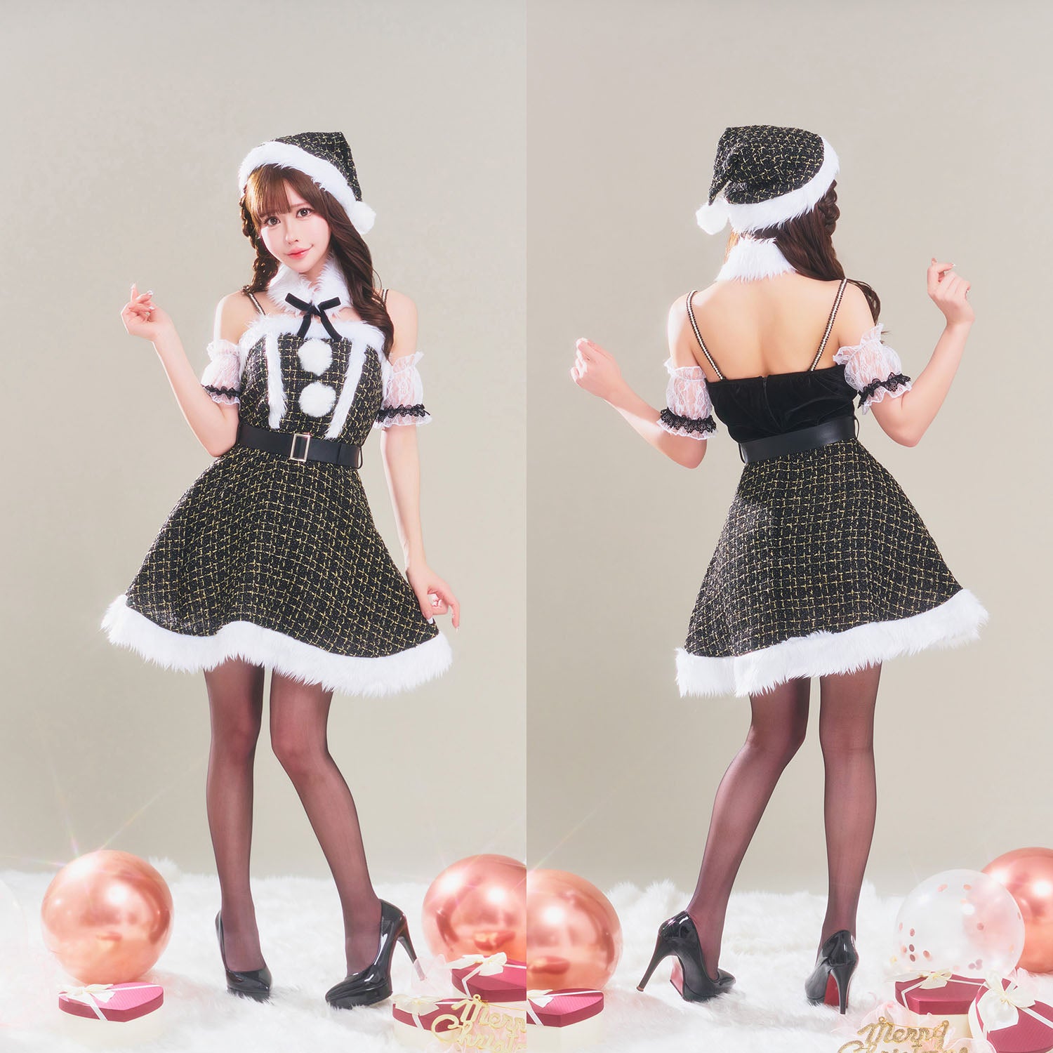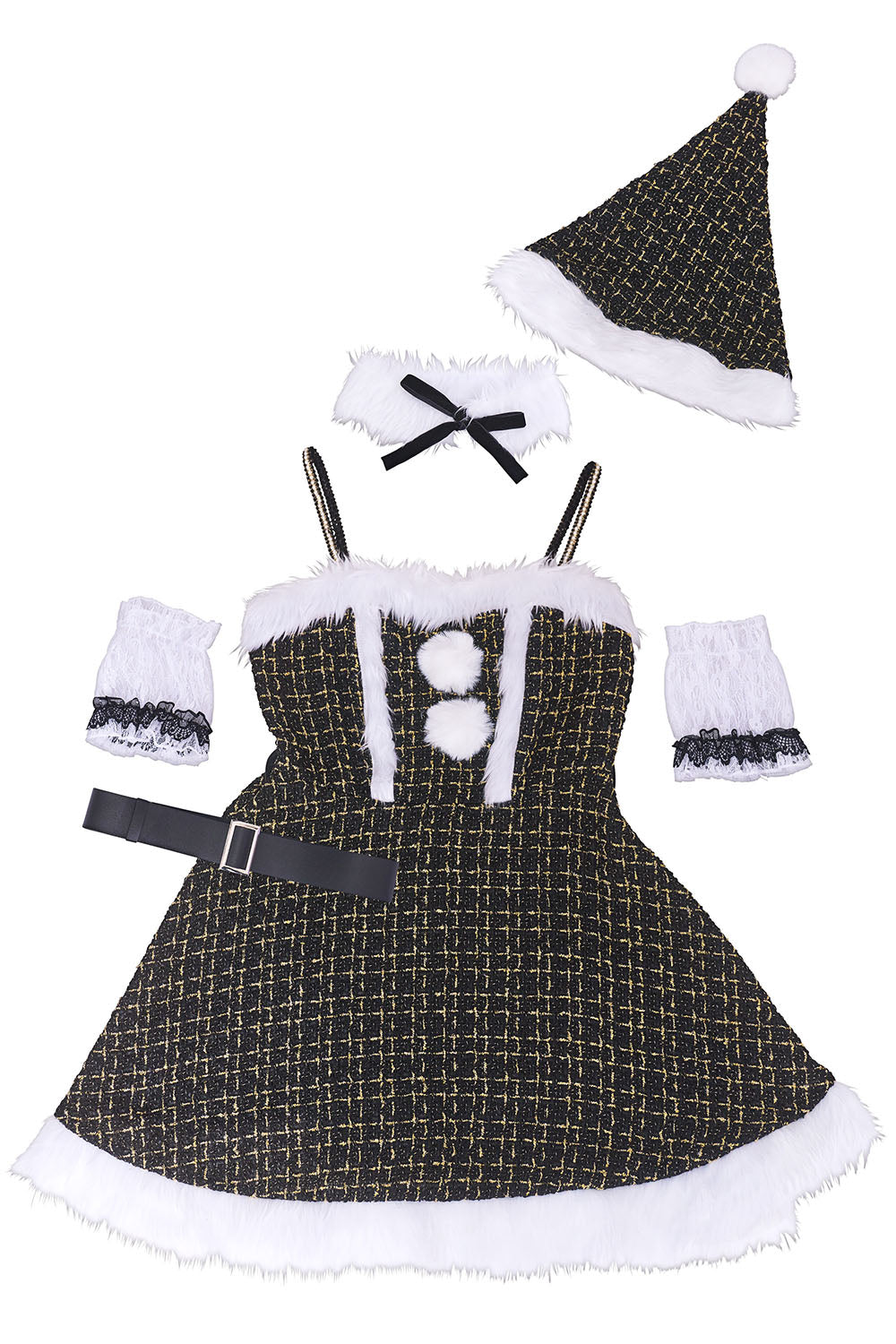 ブラックツイードサンタコスチューム上品でゴージャスな大人のサンタ衣装生地やパーツ、たっぷり使用したファーなど細部までこだわり、ドレッシーな雰囲気を演出。 ワンランク上のスタイルが楽しめる、特別感あふれるクリスマスコスチューム「グランノエル」シリーズ。 上品なブラックツイードを基調にした、大人っぽい印象のサンタコスチューム。 肩にはパールのストラップ、首元にはボリューム感のある付け襟がついており、華やかでゴージャスな雰囲気を演出します。 レースの付け袖が肩から腕まわりを華奢に見せ、ディテールにまでこだわったエレガントな一着です。 |