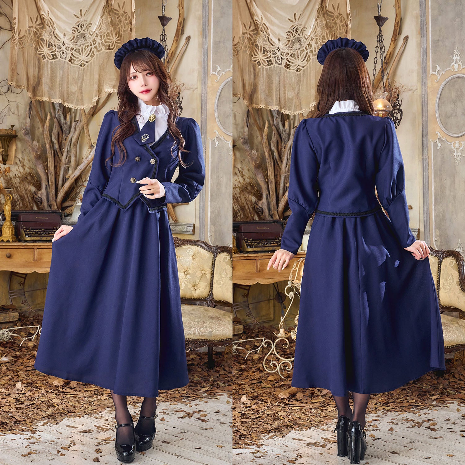 シャツ襟付きジャケットにスカートもウエストゴムなのでとても着やすく、着丈が長い場合はウエストを数回折ると調整出来ます。 変形パフスリーブも上品。 ハロウィンメイクでホラー感を出してみるのもオススメ。