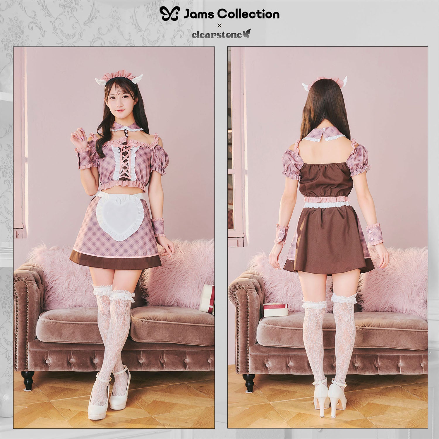JamsCollection 村望しおんちゃん、北乃咲久ちゃん着用♡【スイートキューピッド】いちごミルクをイメージしたくすみピンク×ブラウンカラーのキューピッドコスチュームオリジナルのタータンチェック生地には、こっそりと隠されたハートモチーフが施されており、遊び心満載のデザイン♡ カチューシャにはキューピッドをイメージした羽モチーフが付き! トップスは大きめの丸襟にピンクのハートボタンがあしらわれており、ガーリーな雰囲気を演出。 胸元には編み上げが施されており、バストサイズの調整が可能です。 デコルテ部分はフリル付きの肩ストラップで程よい肌見せを実現♡ スカートには珍しいハート型のエプロンでキューピッド感をさらにアップ! セパレートタイプなので、小柄な方でもスタイルよく着こなすことができます。