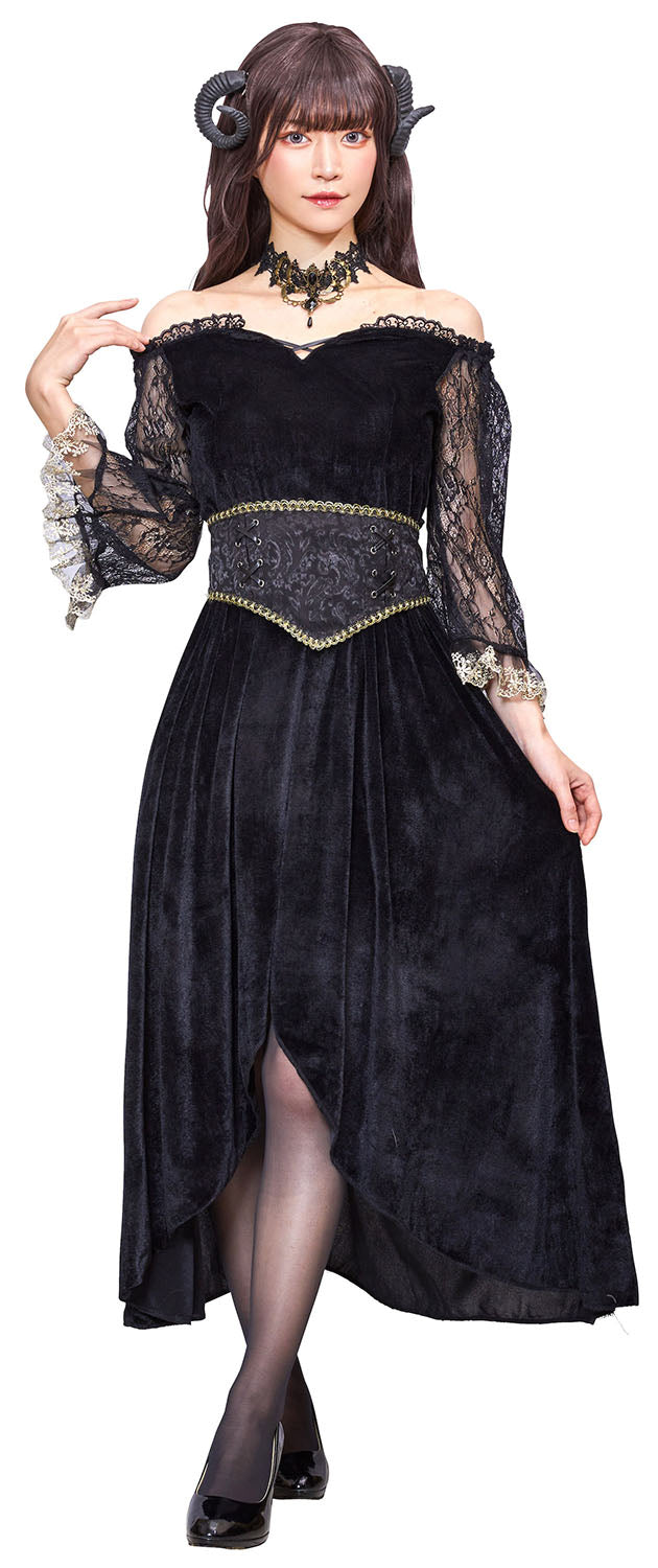 ゴージャスなレースチョーカーが顔周りを華やかにします。 ジャガード生地のコルセットは、後ろの面ファスナーで調節可能。 袖口のゴールドレースが最高にゴージャスです。 大胆なフロントスリットから美しく脚を覗かせて♡