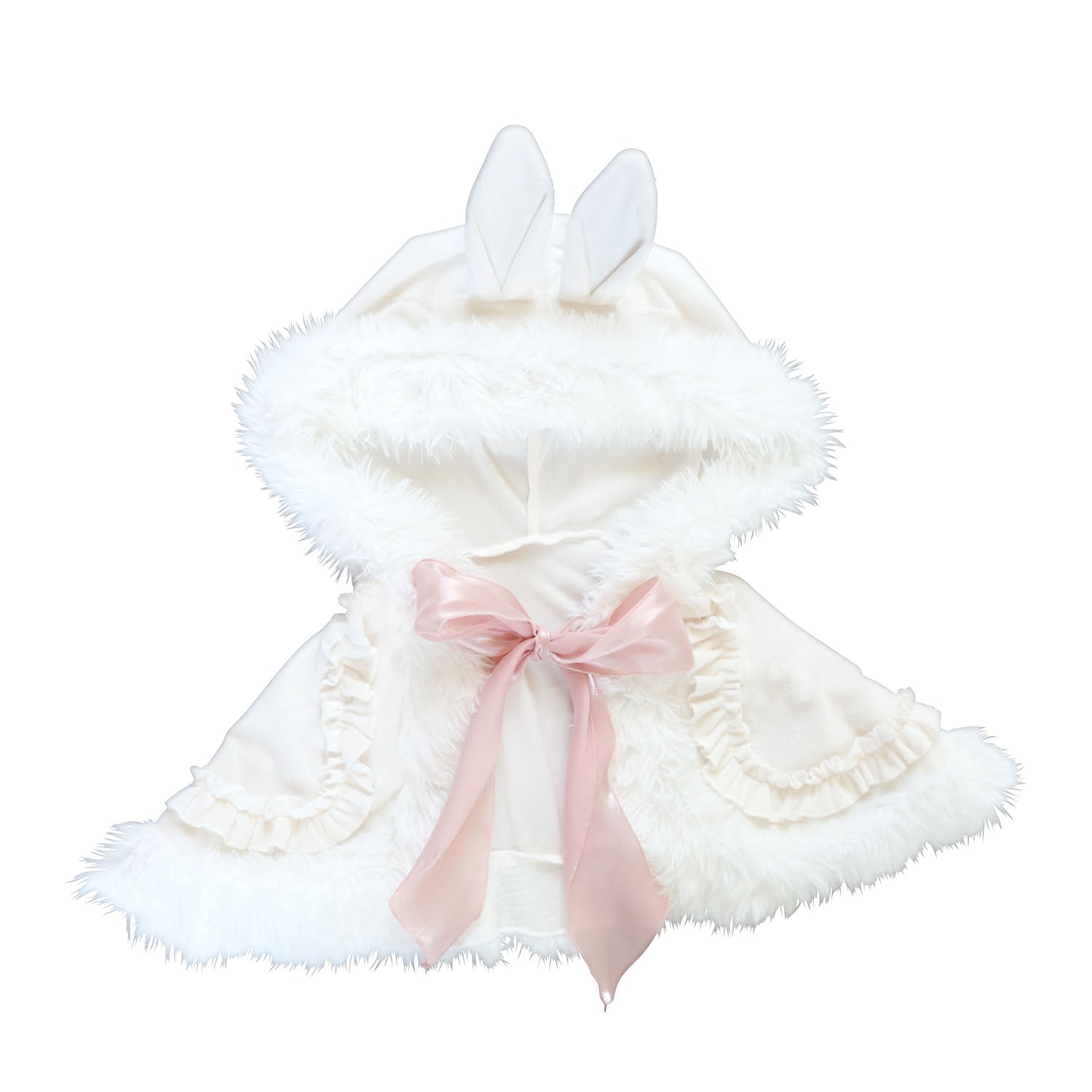 ふわふわのファーとホワイトベロアの組み合わせが、雪のようにピュアな雰囲気を演出します。 フードにはうさぎの耳が付いており、可愛さたっぷり。 首元には太めのリボンをあしらい、フェミニンな印象に。 羽織るだけでクリスマス気分が高まります。 |