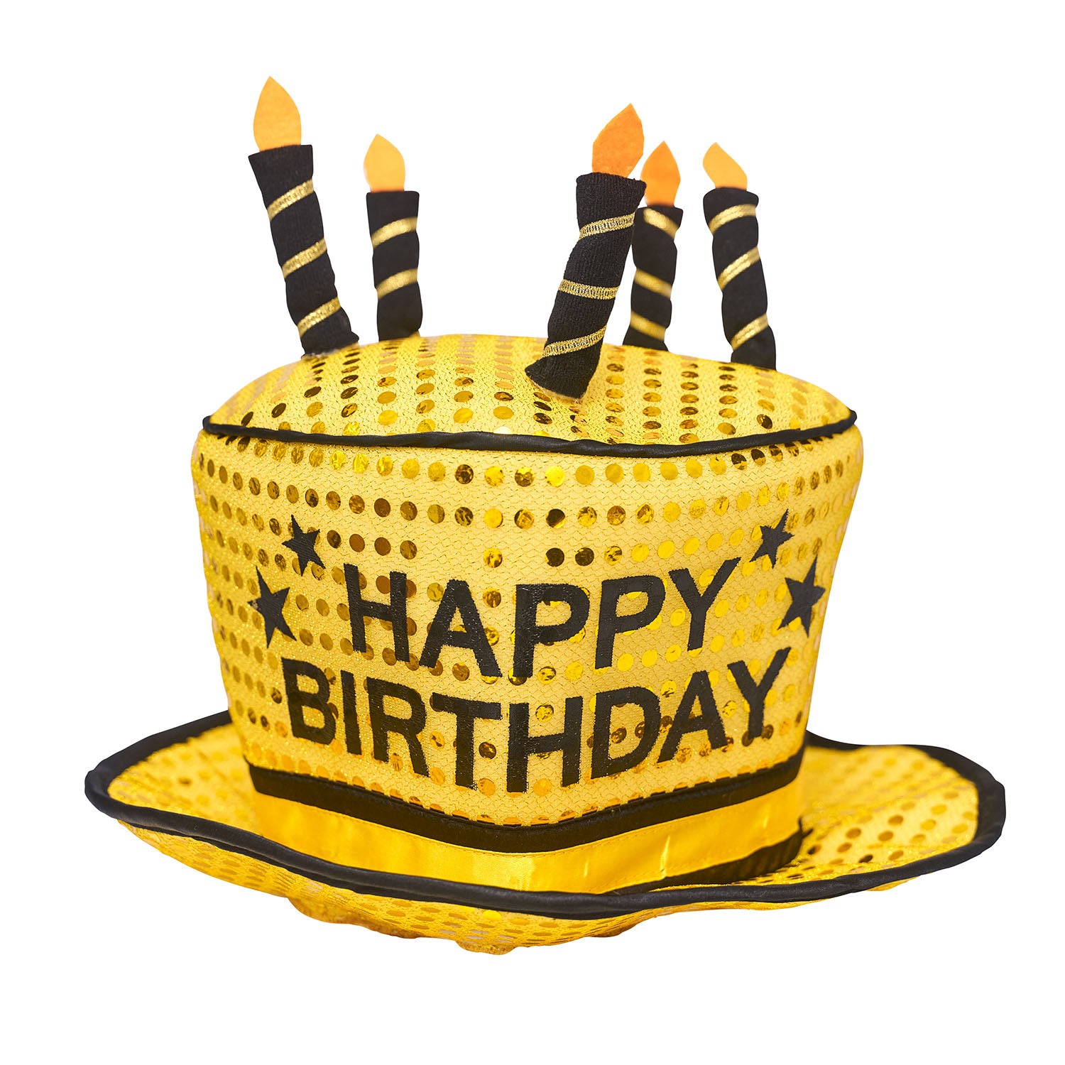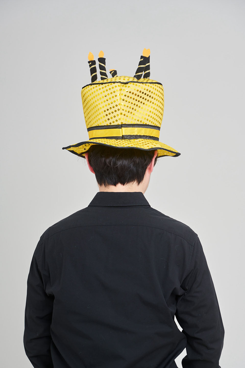 【ゴールドケーキハット】 全面にスパンコール生地を使用したきらびやかなデザインで、存在感たっぷり。 トップには黒のキャンドルモチーフがあしらわれ、バースデー気分を盛り上げます。