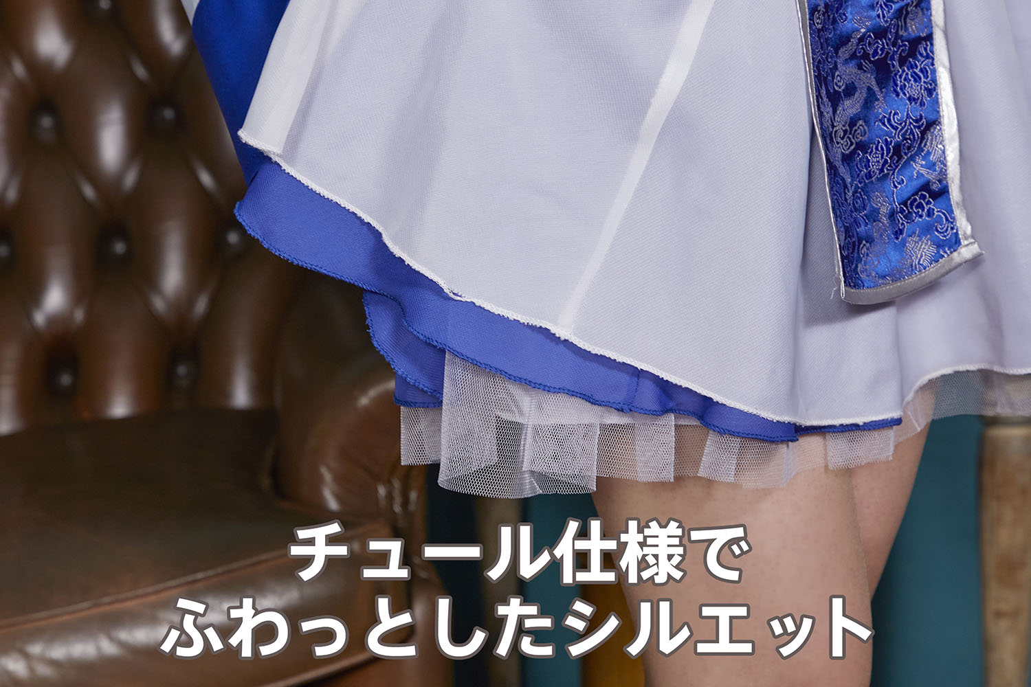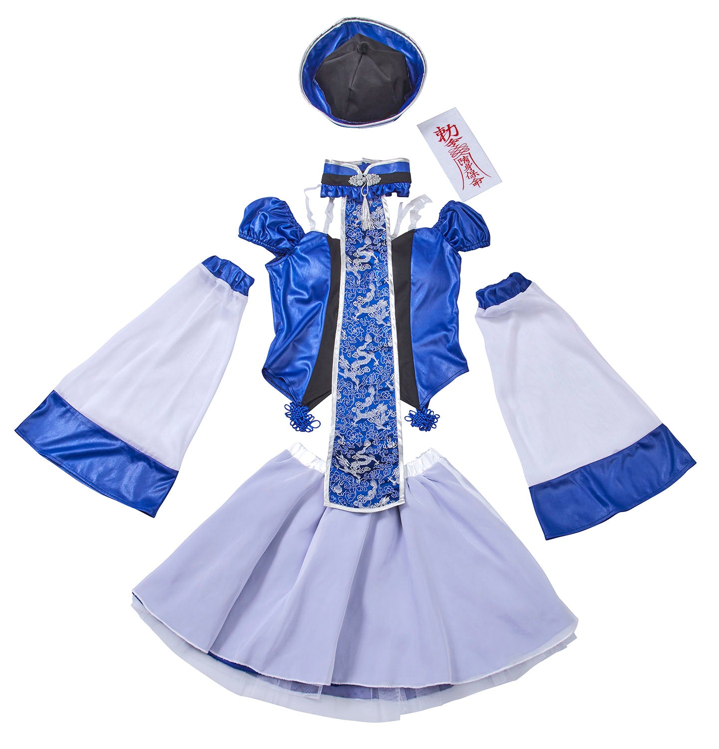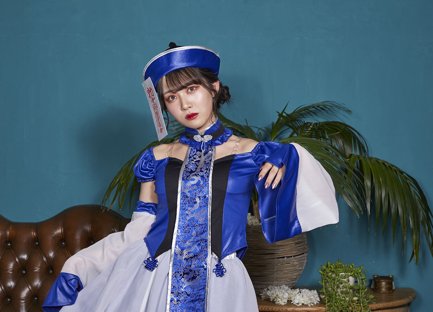 凝ったデザインがキュートかつスタイリッシュ。 スカートはウエストゴムで着やすくなっています。 袖はシフォン素材で透け感が美しい。 袖付け部分はゴムなので、好きな高さに付けて。 胸パッド入り、透明ストラップ付きで安心感あり。 キョンシー帽のお札は取り外し可能です。 |