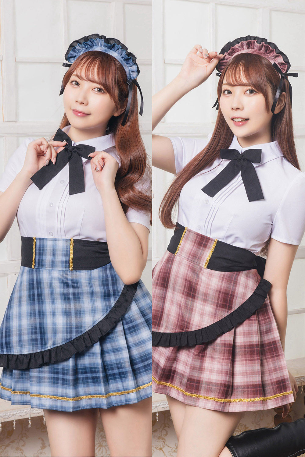ゴールドのボタン、ブレード、チェーンがアクセントに。 ジャケットを脱ぐとカジュアルなウェイトレスに大変身! エプロンはアシンメトリーでおしゃれなデザイン。 ブルーとピンクの二色展開で、双子コーデも楽しめます♡ パニエ内蔵なので、中のチュールを広げるとふわっと広がります。 |