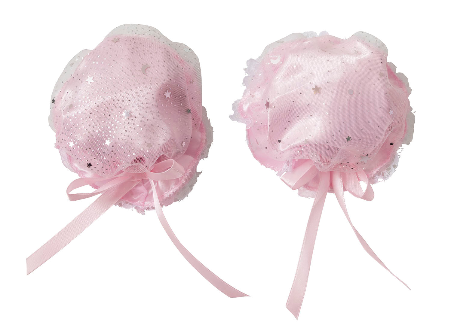キラキラが可愛いチャイナ風ヘアアクセサリーお手持ちのコスチュームや私服に合わせて可愛く。パステルピンクのサテン生地にシースルーのキラキラ生地を重ねたお団子カバー。 星と月のキラキラな模様がファンシーでかわいい♡ 手持ちのチャイナ服にコーディネートしたり、ファッションアイテムとして大活躍! 裏側にはピン用ループとピンが付いているので便利。 |
