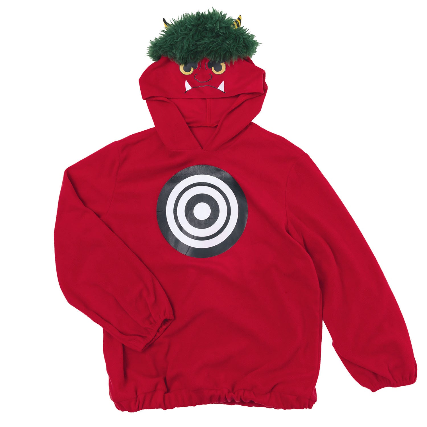 遊べるデザインの鬼パーカーフードの鬼顔×豆まき的プリント付き節分にぴったりな鬼のパーカーです。 胸元には的のデザインがプリントされており、豆を的に向かって投げて遊べます。 フードにはコミカルな鬼の顔がプリントされ、角は立体的な仕様です。 ふさふさの緑色の髪がアクセントになっています。 生地は暖かく着心地の良いフリース素材を使用。 袖口と裾にはゴムが入っており、体にほどよくフィットするため女性も快適に着用できます。 |