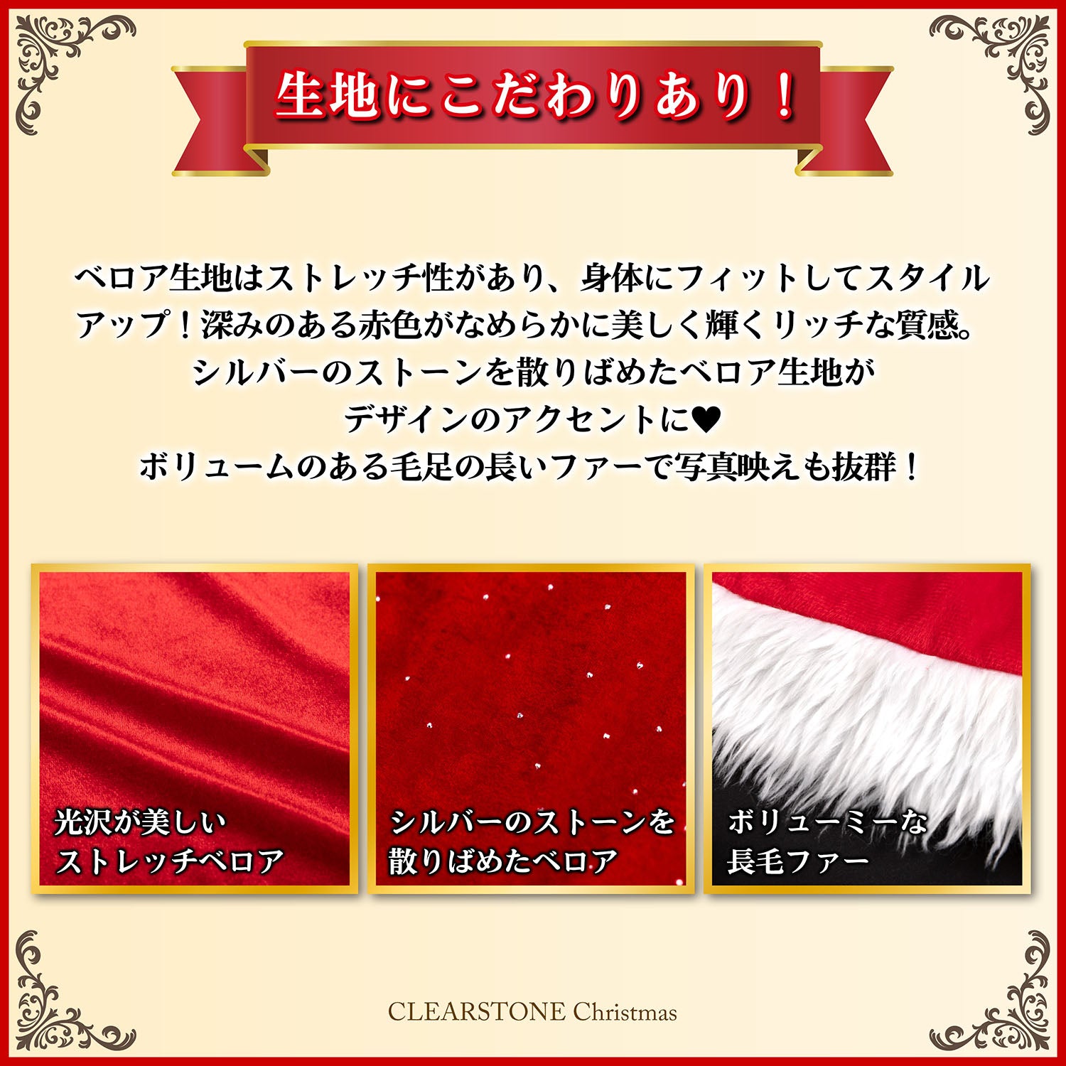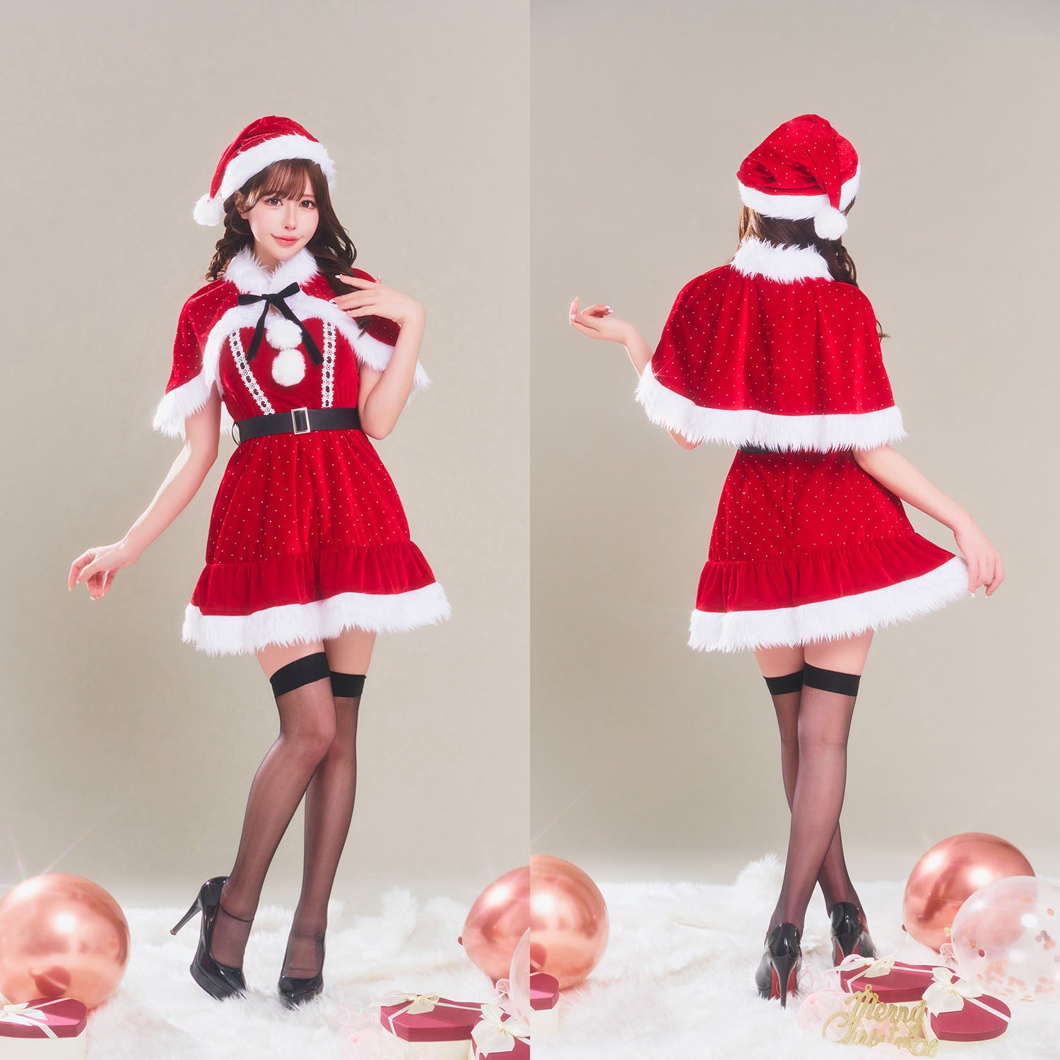 赤ベロア×ラインストーンサンタ大人可愛いクリスマスコスチュームワンランク上のスタイルが楽しめる、特別感あふれるクリスマスコスチューム「グランノエル」シリーズ。 落ち着いた赤のベロア生地に、ラインストーンがきらめくサンタコスチューム。 生地やパーツ、たっぷり使用したファーなど細部までこだわり、ドレッシーな雰囲気を演出。 ベアトップ型のワンピースには、長さ調整可能な透明ストラップ付き。 付属のケープでシーンに応じて露出度の調整も可能です。 黒のリボンやベルトが全体を引き締め、スタイリッシュな印象に。 ワンピースの裾は切り替えのギャザーフリル仕様で、奥行きのあるシルエットを演出。 胸元にあしらわれた梯子レースが、大人っぽさの中に可愛らしさを添えます。 |