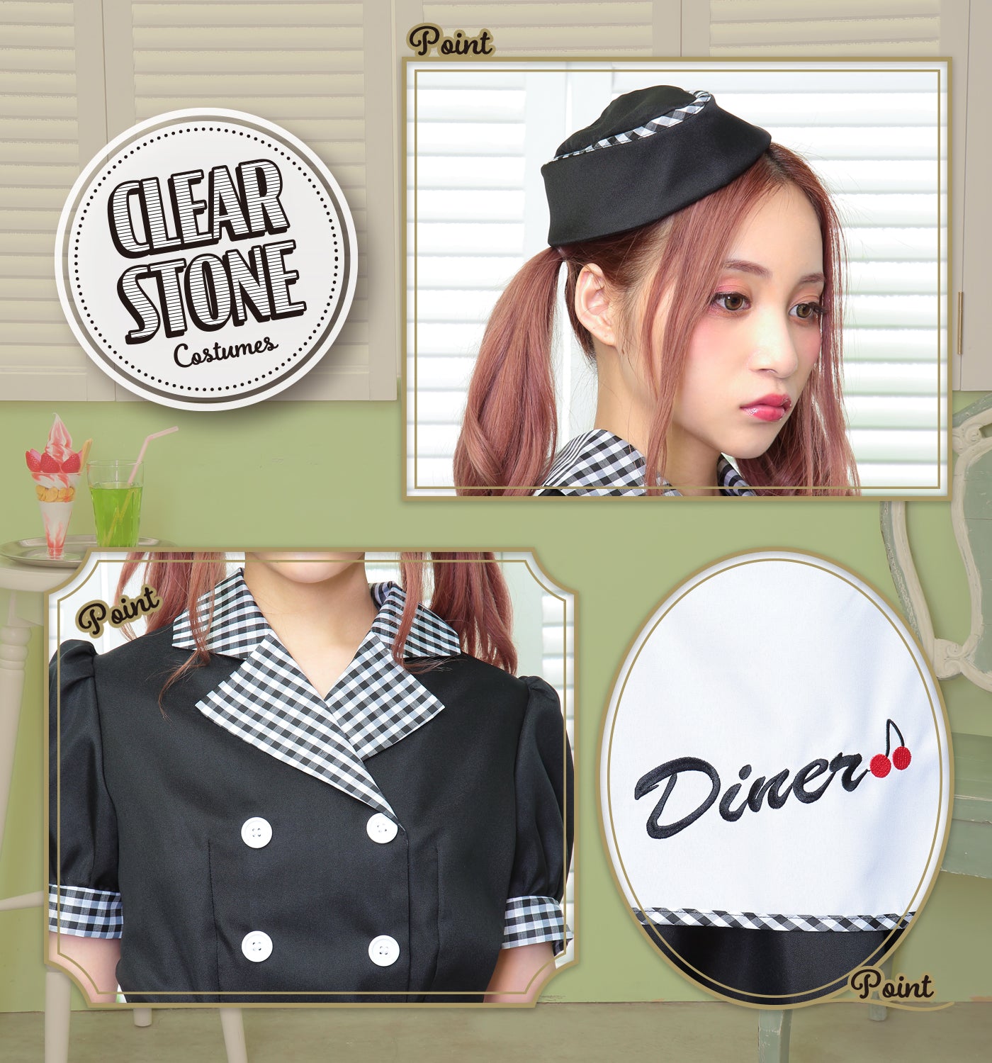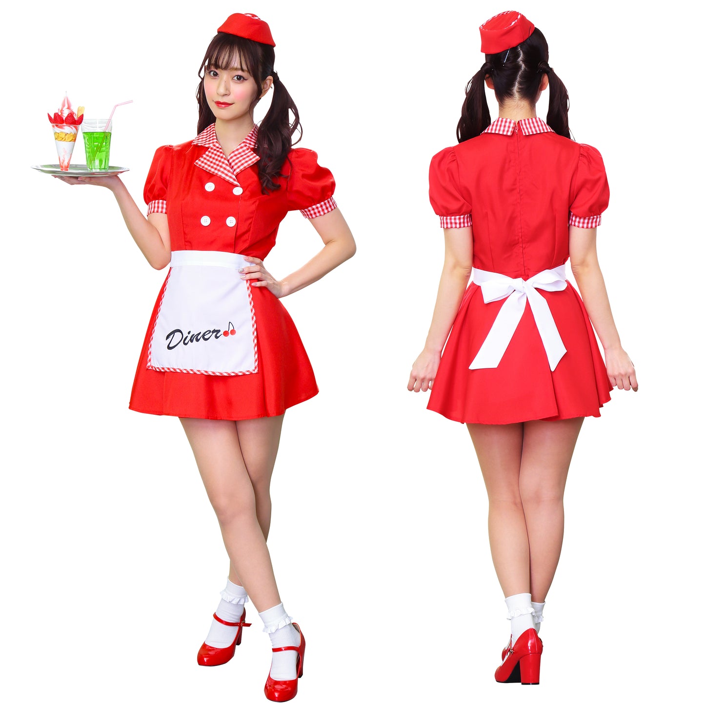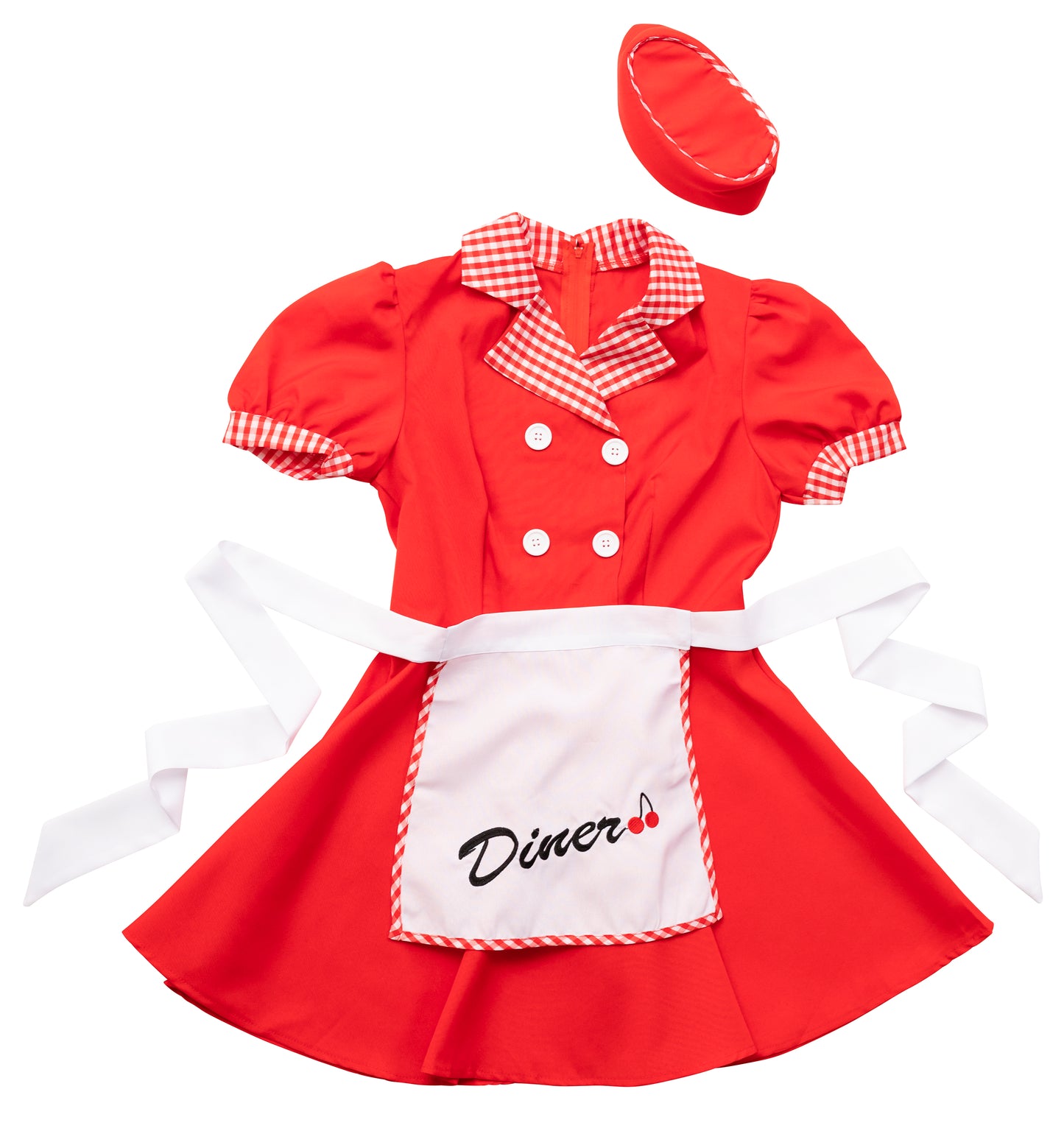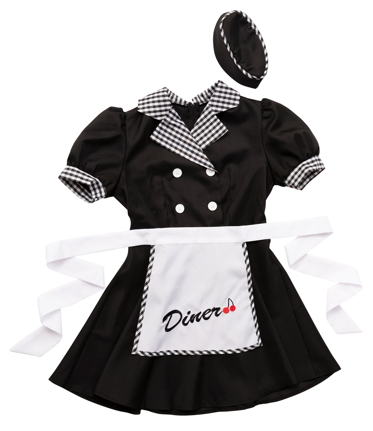 ギンガムチェックが可愛いダイナーガールコスチューム。「Diner」の文字とチェリーの刺繍入りエプロンがポイント!
