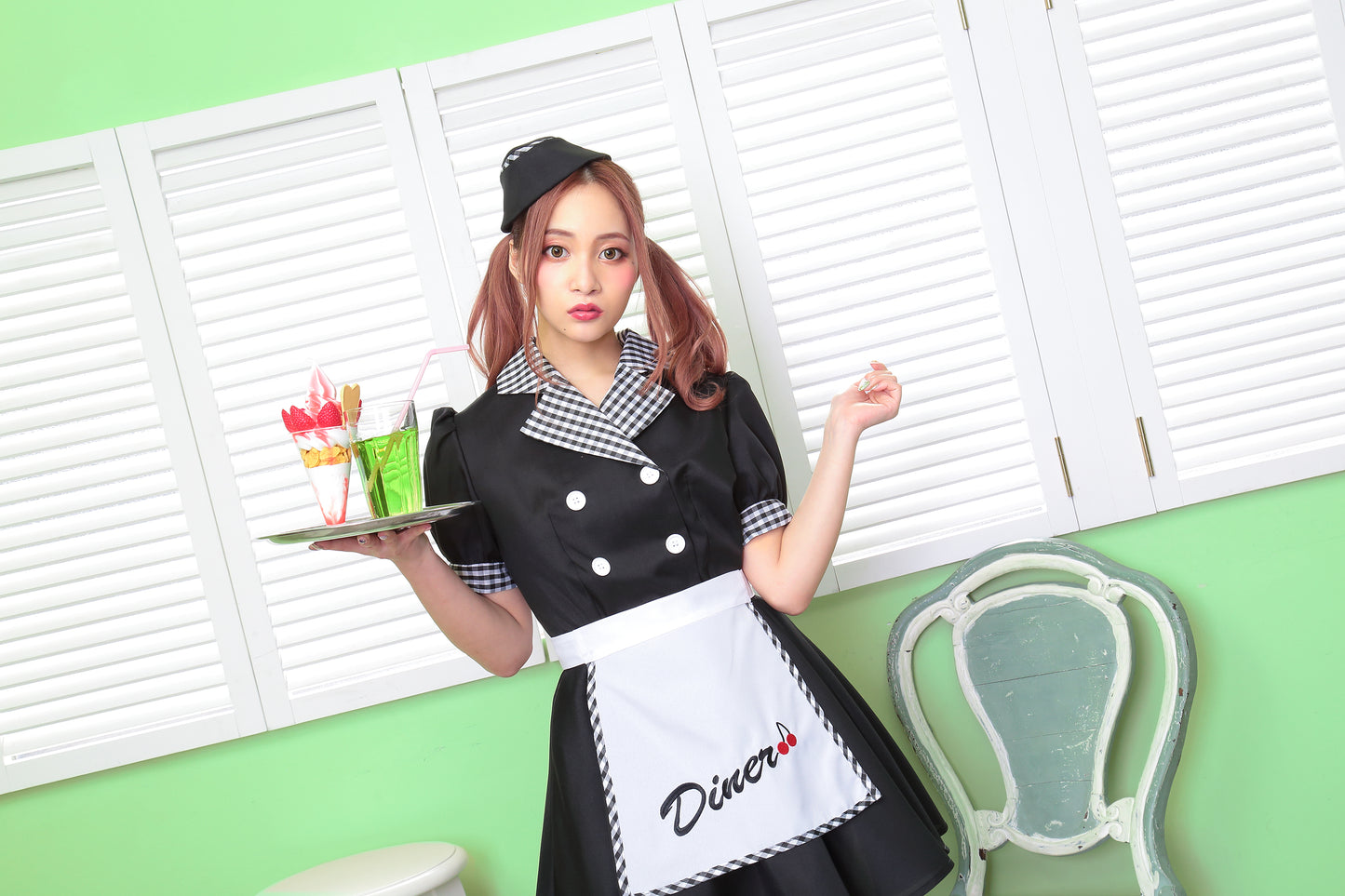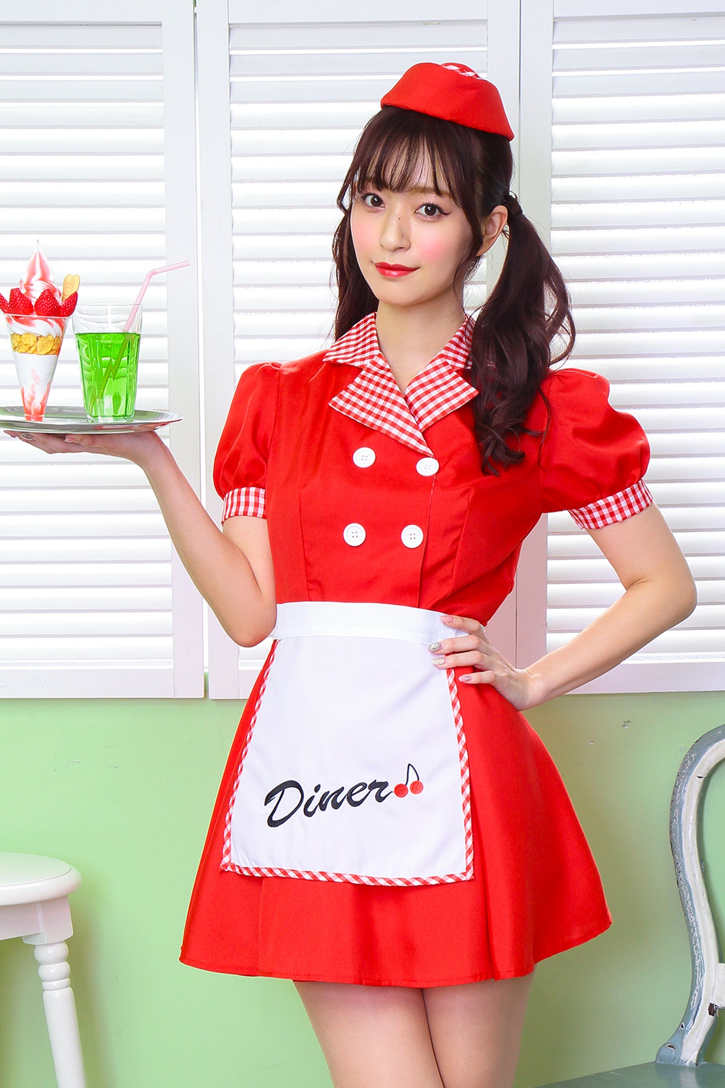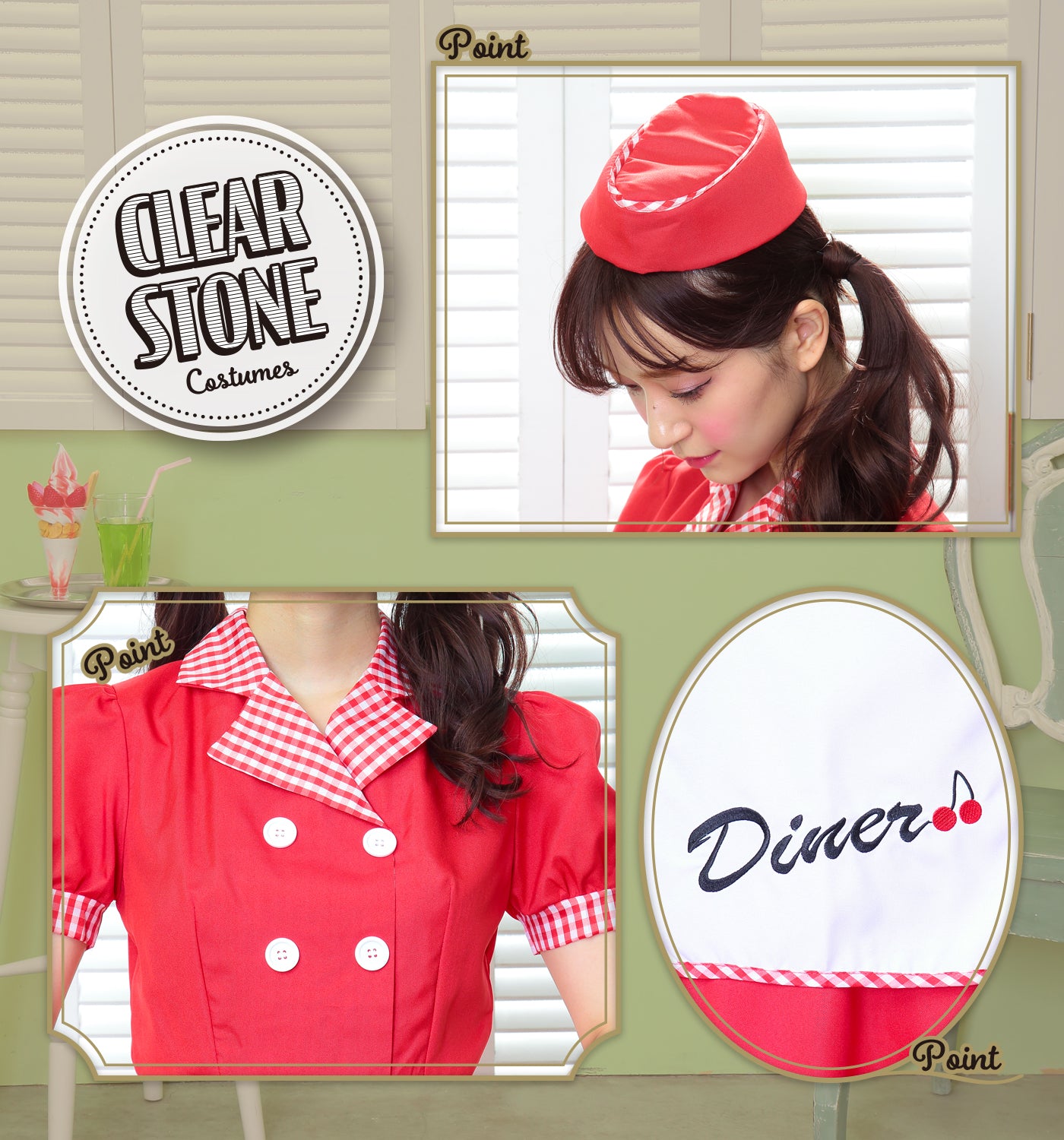 ギンガムチェックが可愛いダイナーガールコスチューム。「Diner」の文字とチェリーの刺繍入りエプロンがポイント!