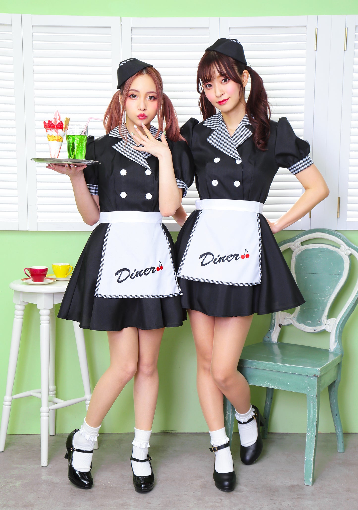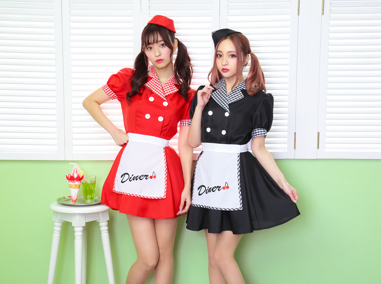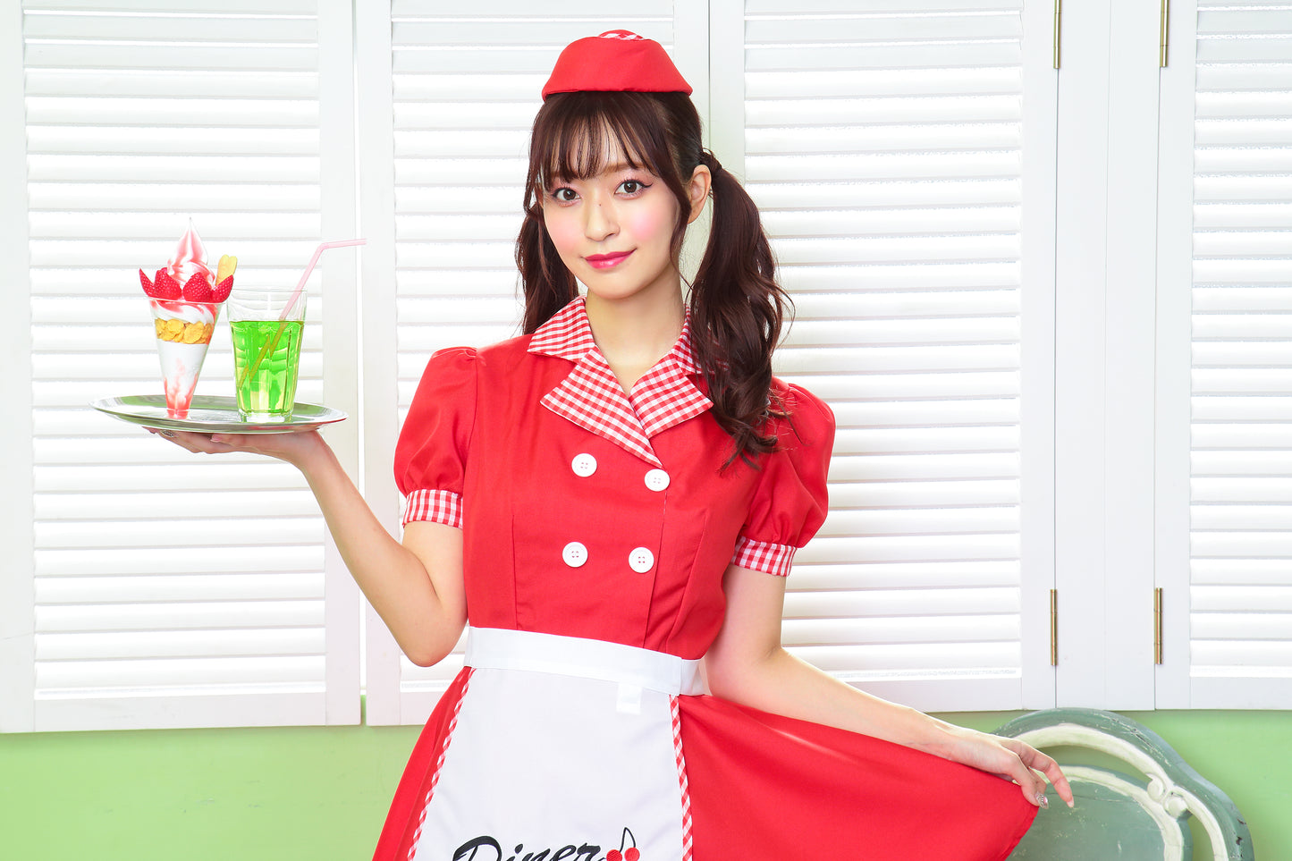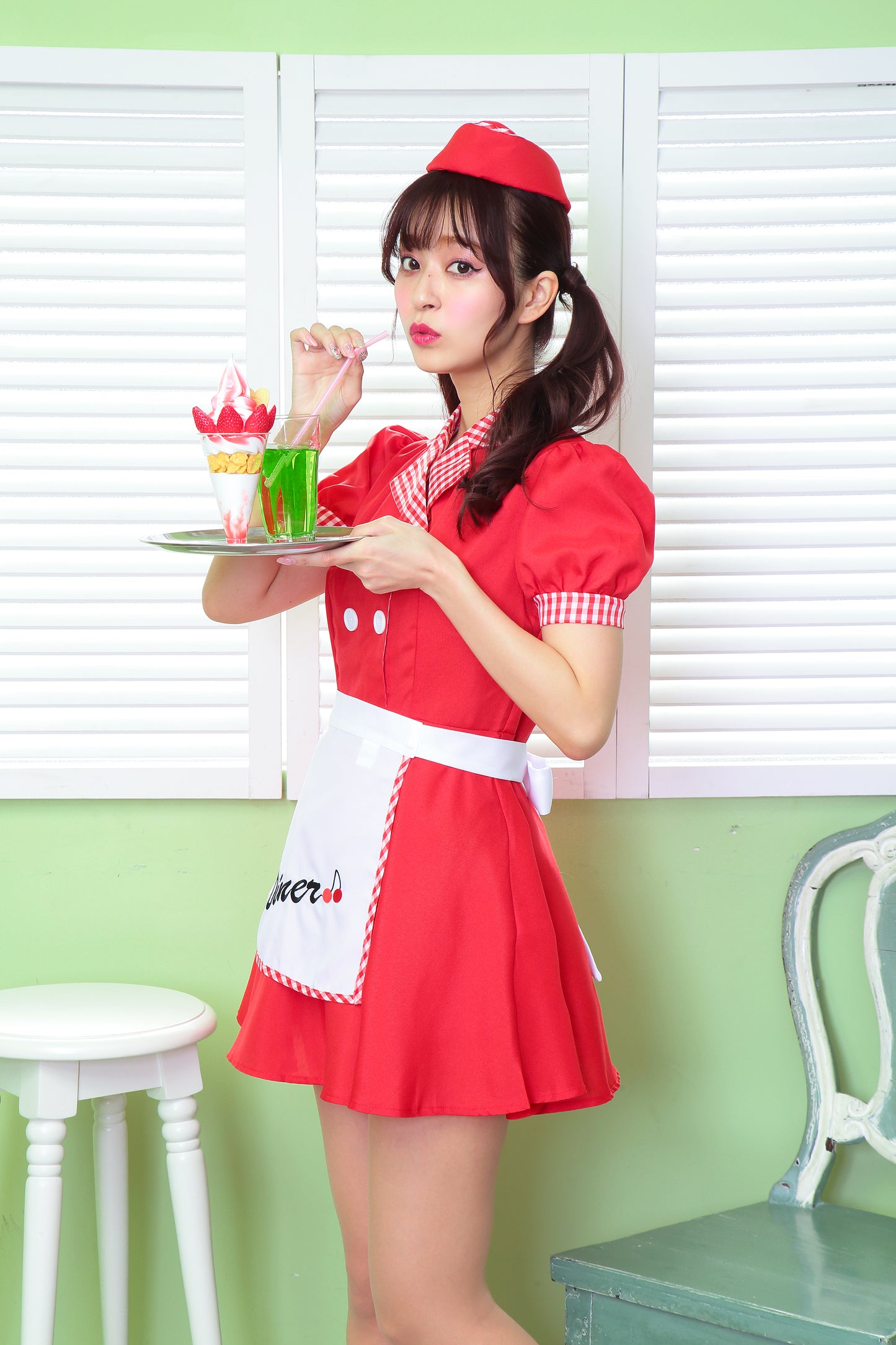 ギンガムチェックが可愛いダイナーガールコスチューム。「Diner」の文字とチェリーの刺繍入りエプロンがポイント!
