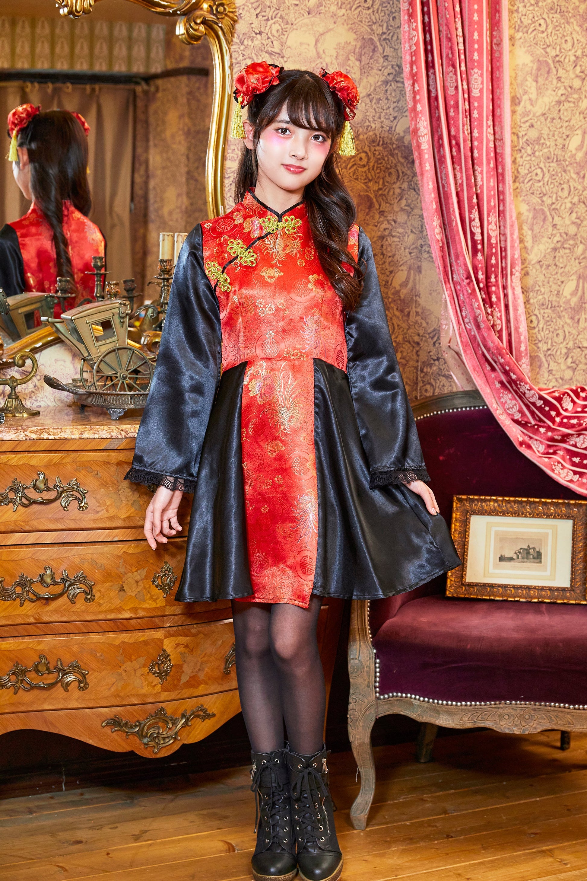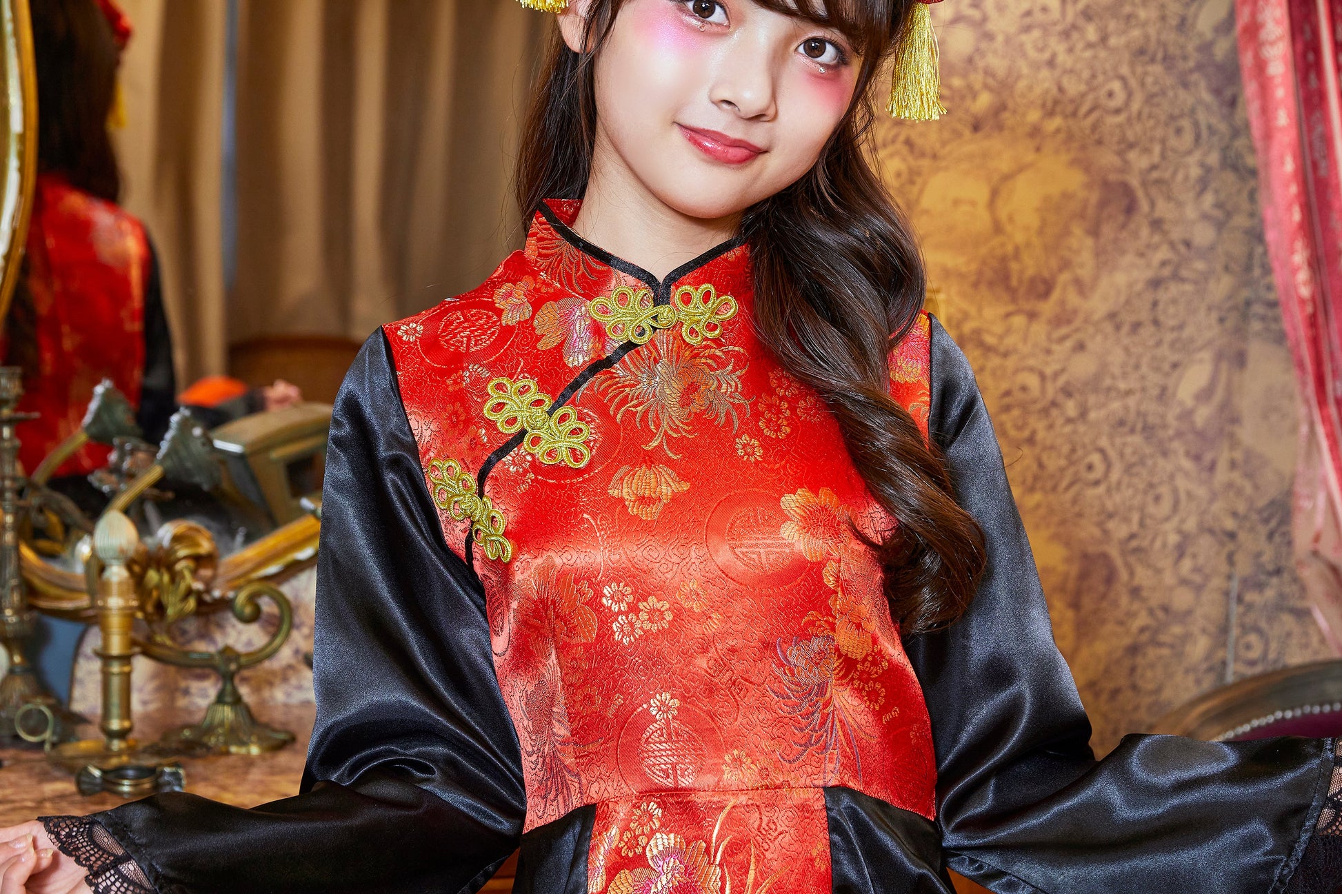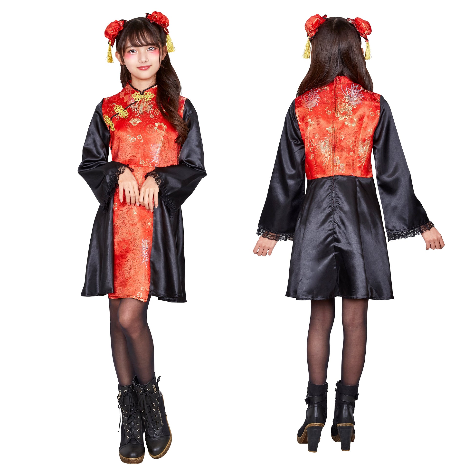 コスプレ ジュニア こども チャイナ COSCHU! チャイニーチャイナ 140~150cm ブラック レッド/ブルー【クリアストーン】