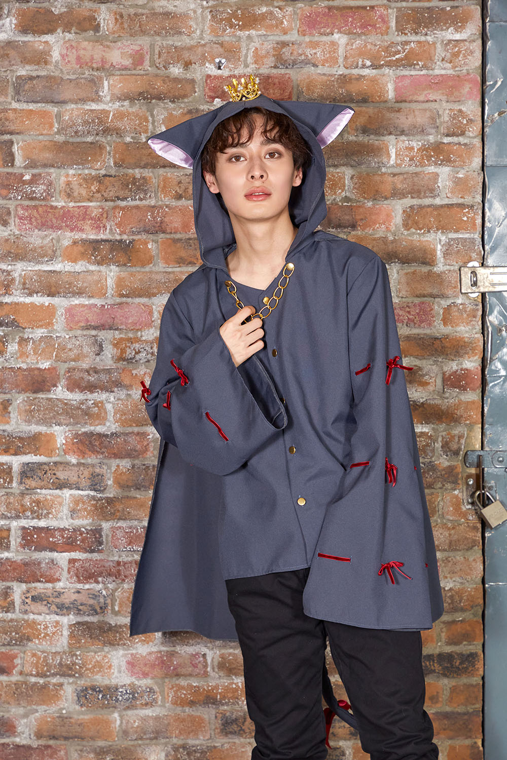 大きな耳にリアルなクラウン(裏側にクリップ付き)首元にはチェーンが付いたマント一体型シャツ。