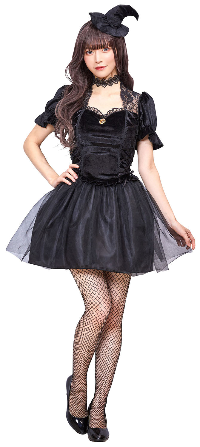 王道の魔女コスチュームを、オシャレでクールにデザイン。 肩回りのレースのカットがデコルテの美しさを演出し、サイドの編み上げデザインでスタイルアップ。 ミニハットは、カチューシャ仕様なので、髪型も崩れにくく使いやすいです。 ハットの位置はカチューシャ上で左右に動かせます。 胸元の大きなビジューが神秘的。 オールブラックコスチュームですが、ベロア生地やチュールなど異素材の組み合わせにより高級感があります。