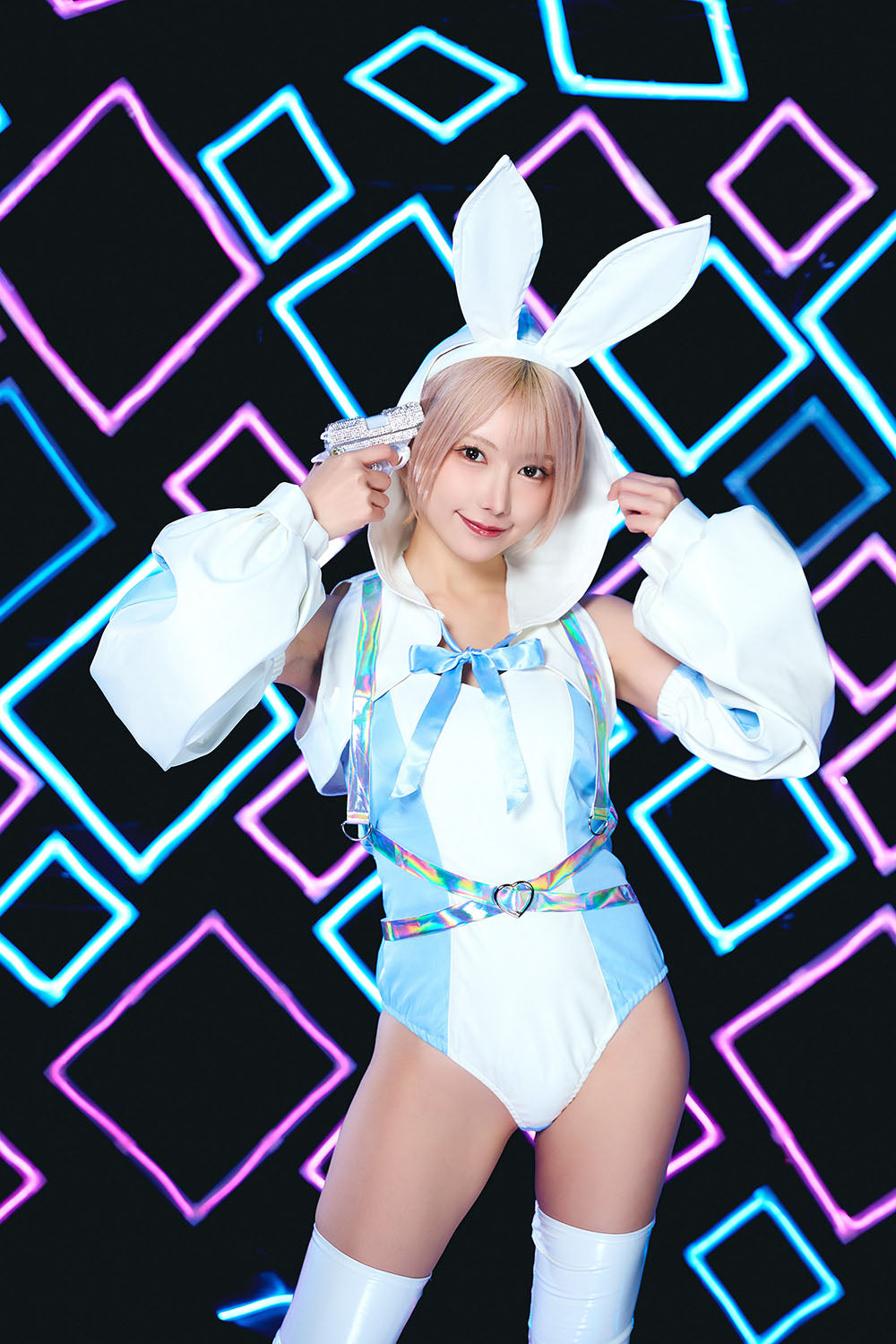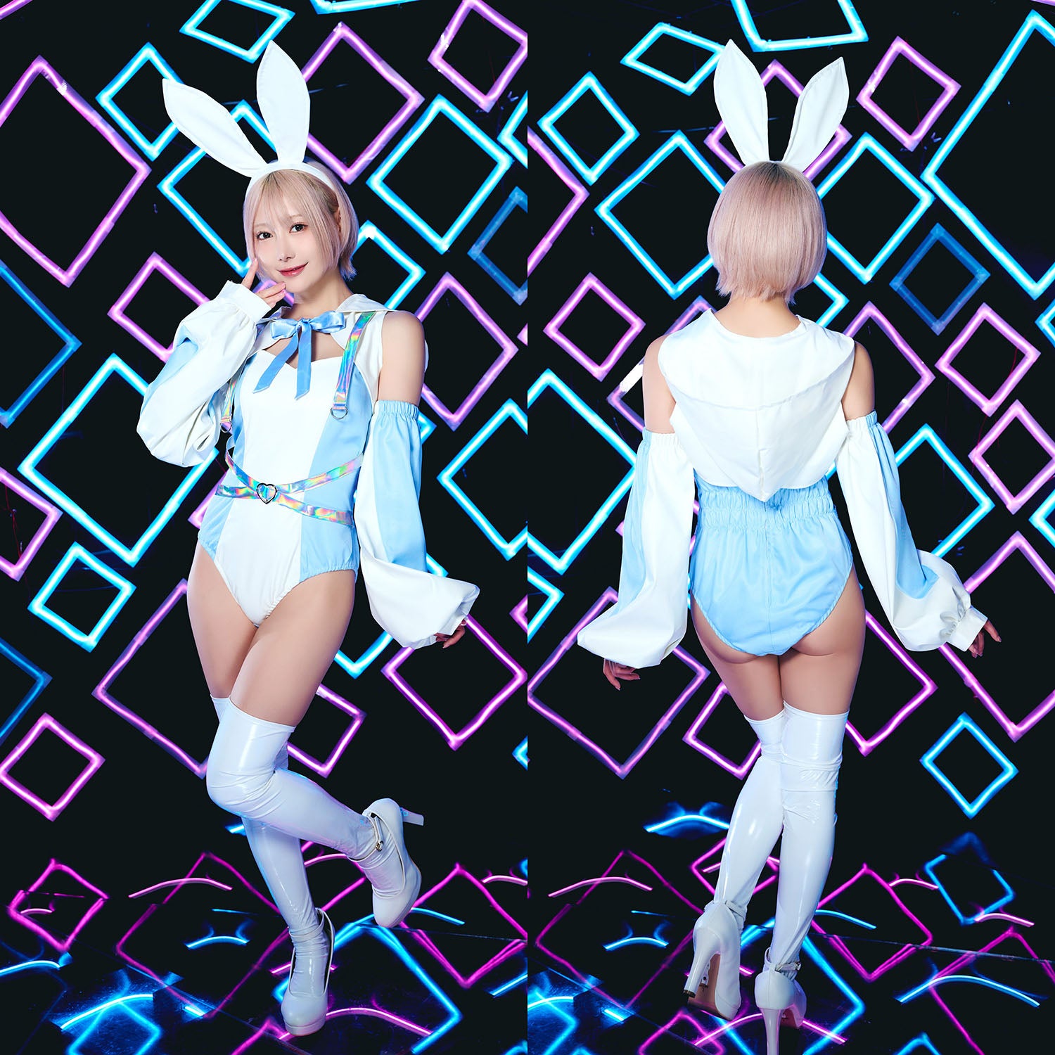 白合皮を使用した高見え必至の素材感。 フード付きボレロ×バニーガールモチーフが新しい。 大きめのうさ耳カチューシャはワイヤー入りなので、お好きな形にカスタムできます。 存在感のあるフード姿で振り向きポーズもバッチリ。 肩とウエストのオーロラテープはキラキラと反射し、近未来的な雰囲気を演出。 ウエストのハートバックルもポイントです。 レオタードの縦切替は細見え効果抜群。 さらに後ろウエストは2段シャーリング仕様で体型に合わせてフィットします。 レオタードは透明の肩ストラップ付きなので身長に合わせて調節可能。 個性的な切替の付け袖はボリュームたっぷり、どんなポーズもバッチリ決まります。 |