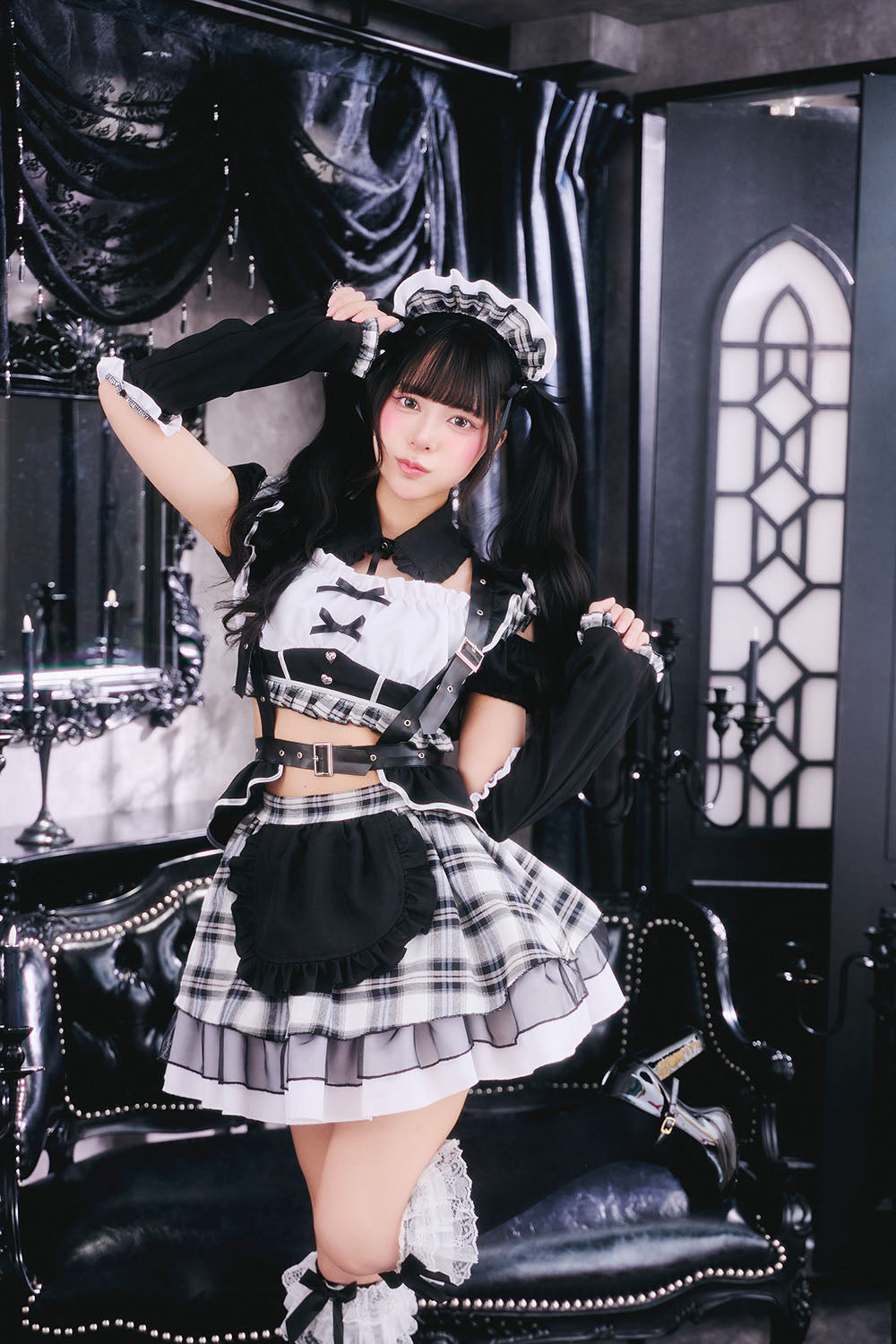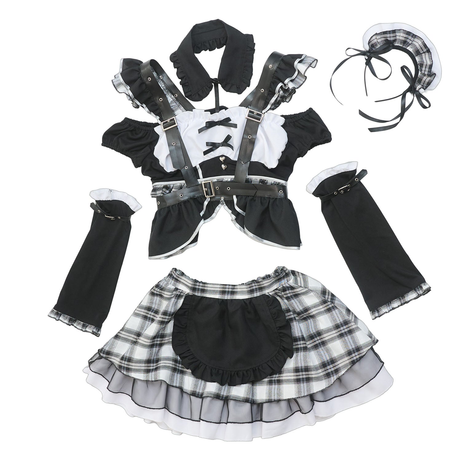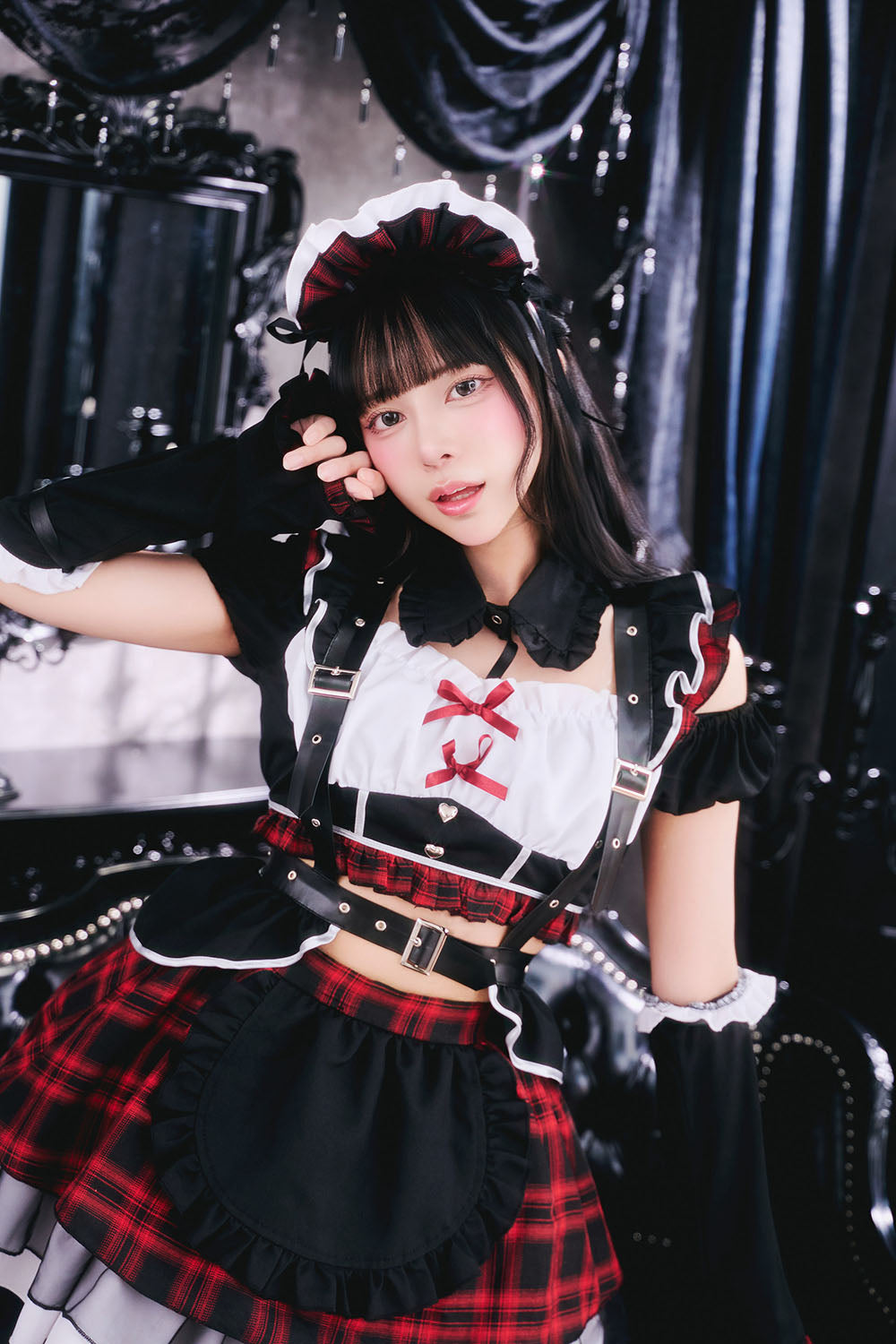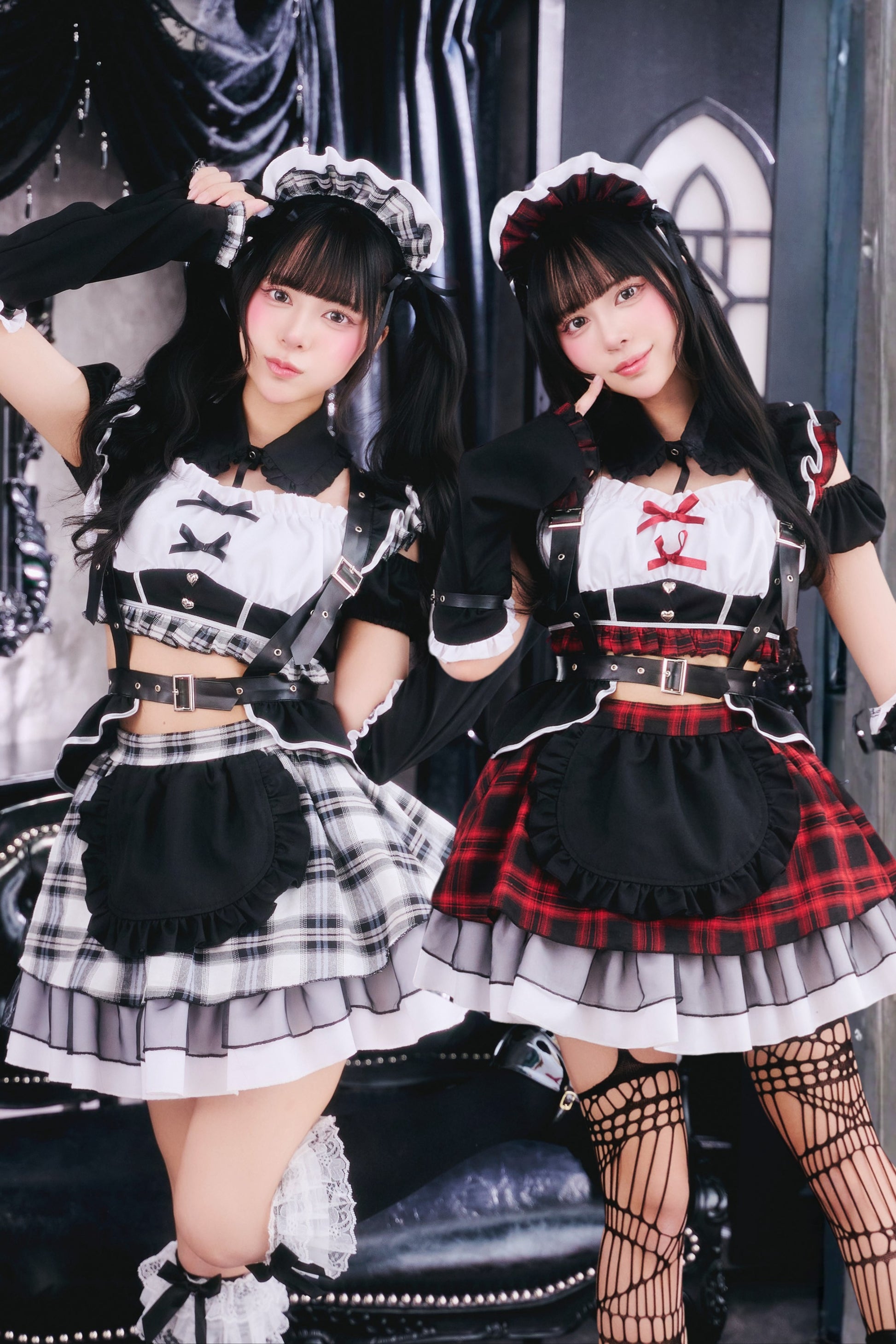 甘さとダークが共存するゴスロリ×パンクコスチューム新シリーズ「♰ゴスパンドール♰」ゴスロリとパンクテイストを掛け合わせた、「かわいさの中にダークさを秘めた世界観」を表現した「ゴスパンドール」シリーズ。 ブラックを基調に、モノトーンチェック/赤チェックを組み合わせたロックテイスト漂うメイドコスチュームです。 胸元にはあえて白い生地を使用し、全体の印象を引き締めつつ、コントラストの効いたデザインに仕上げました。 ハーネス付きベルトやアームカバーをセットにすることで、メイドスタイルに程よいハード感をプラスし、シリーズらしいエッジの効いた印象を演出しました。 一方で、フリルやリボンなどの装飾を随所に取り入れ、可愛らしさもしっかりとキープ。 甘さとロック感のバランスにこだわり、撮影やイベントシーンでも存在感のあるスタイリングを楽しめます。 |