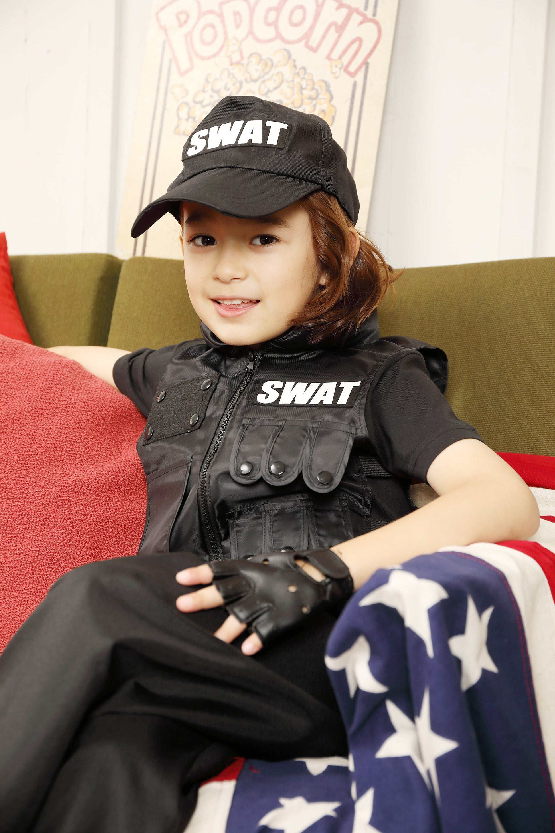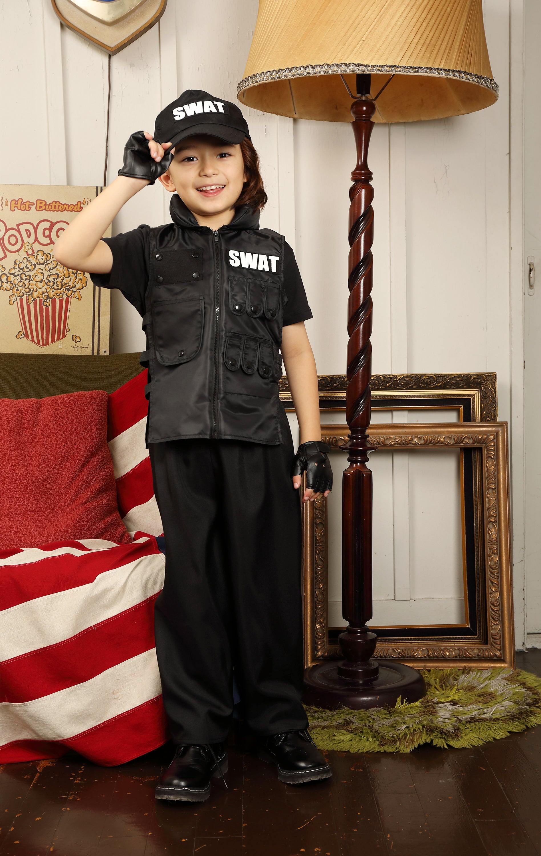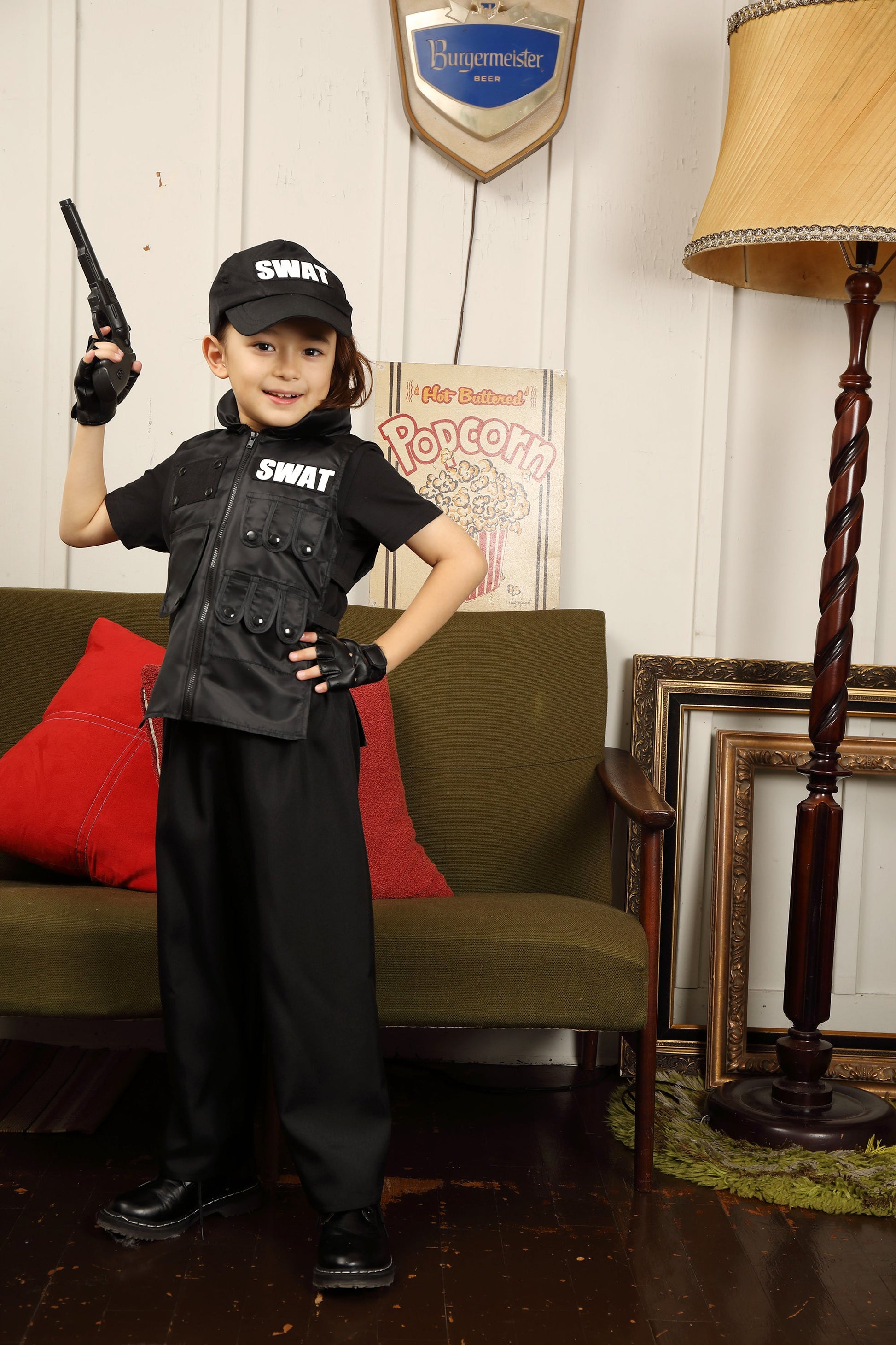 黒を基調としたかっこいいスワットコスチューム4点セット。ベストは私服の上に羽織りやすく、パンツはウエストゴムで着やすい仕様です。 |