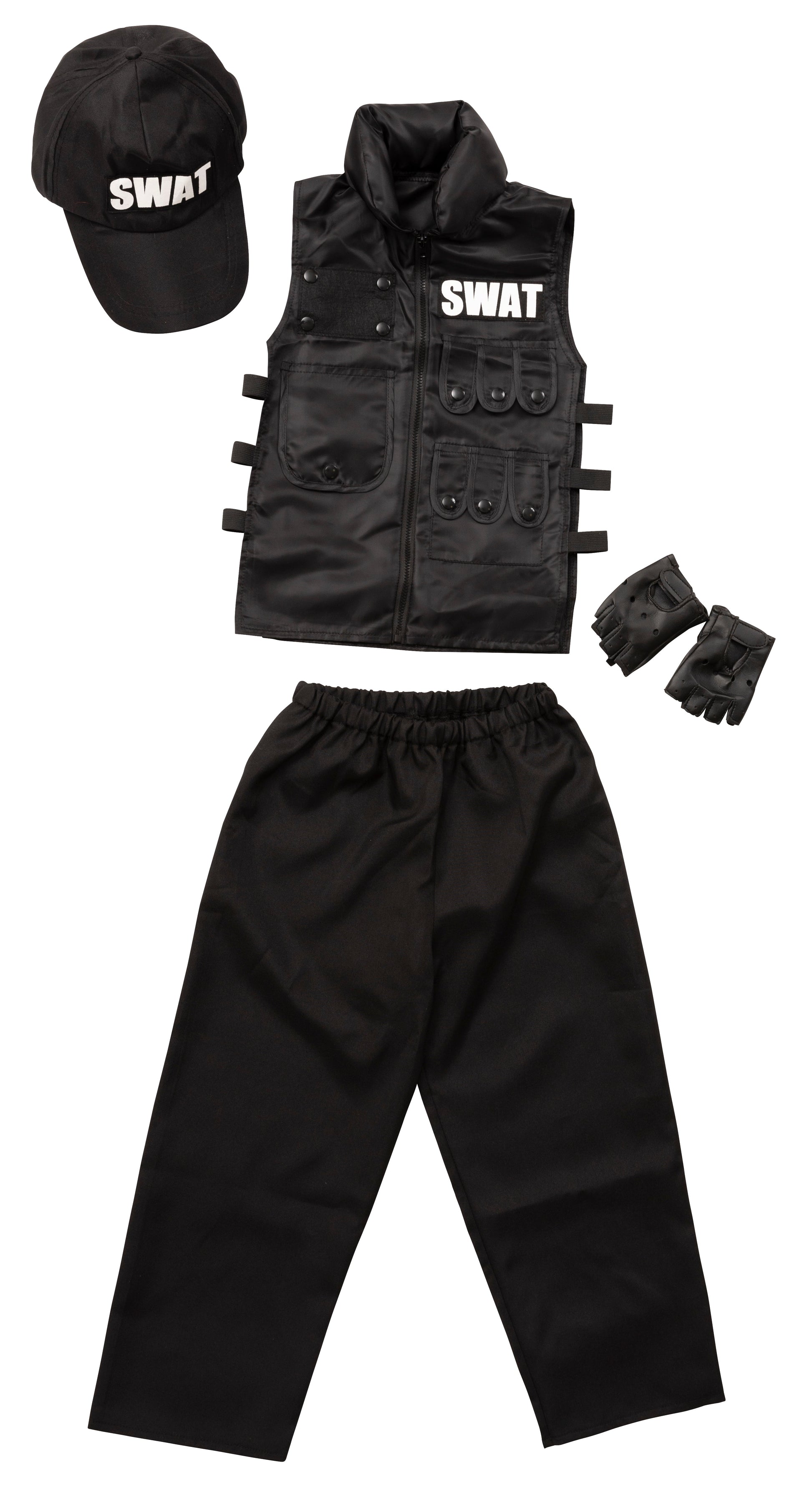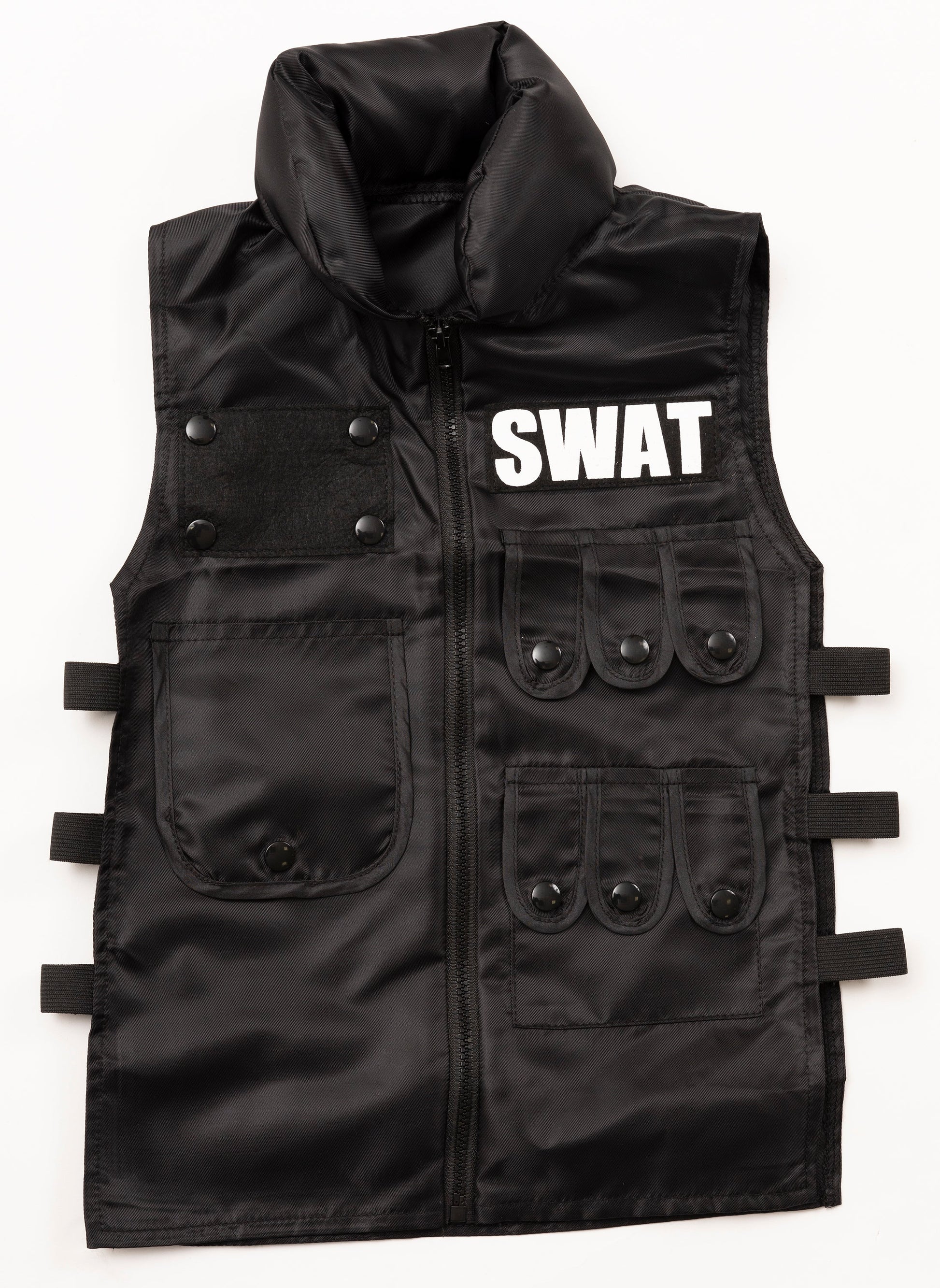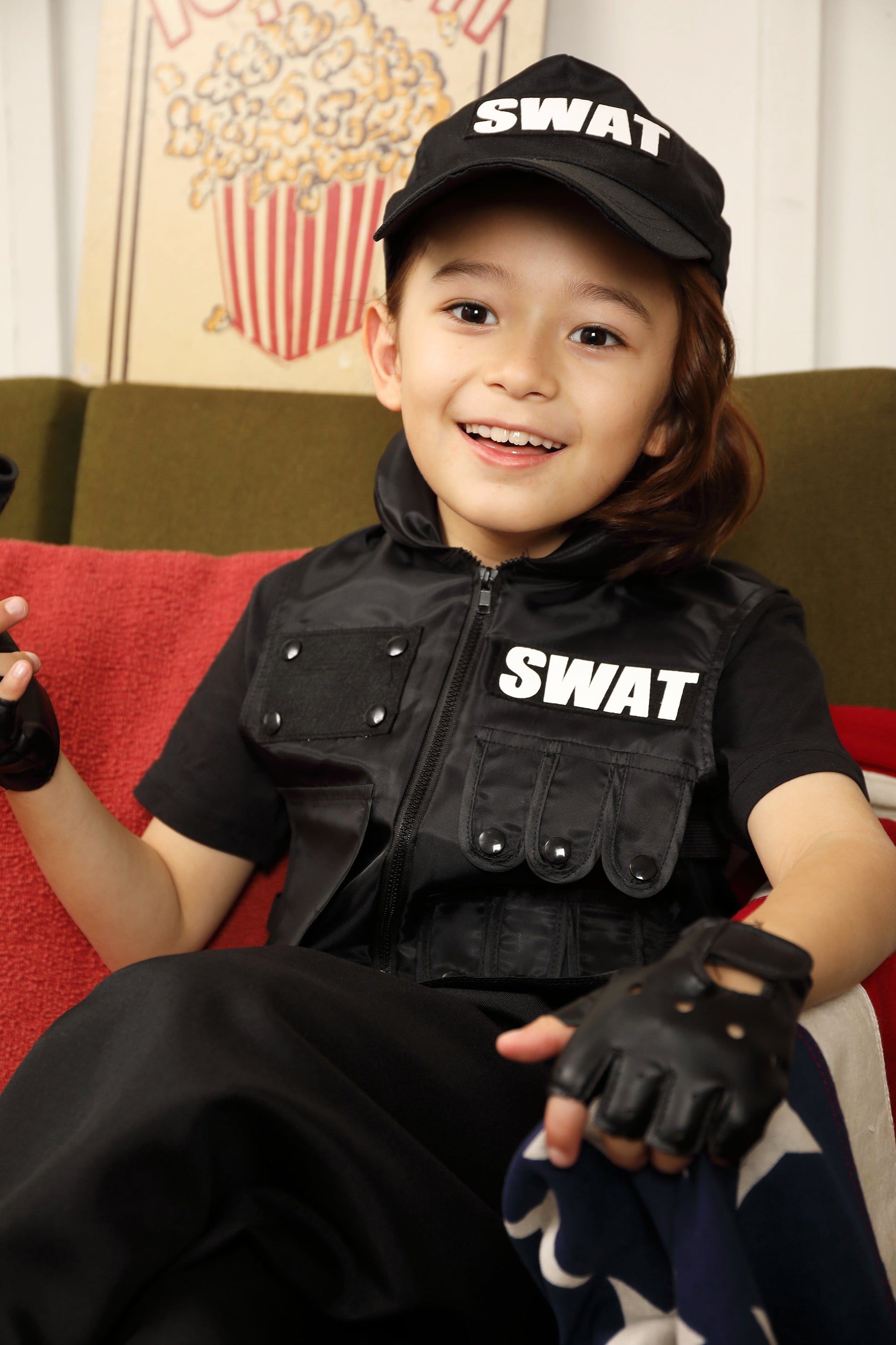 黒を基調としたかっこいいスワットコスチューム4点セット。ベストは私服の上に羽織りやすく、パンツはウエストゴムで着やすい仕様です。 |