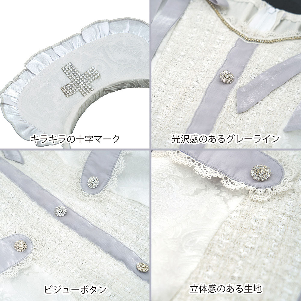 ツイード生地とジャガード生地をメインに使用し、豪華なイメージに。 グレー色のシフォン生地もキラキラで自撮りも映えます。 カチューシャの十字やボタンはキラキラ輝くラインストーン。 光沢のある厚手サテンのグローブにはマラボー(羽)が付いています。 パールやラインストーンなどの大振りアクセサリーに合わせると更にゴージャス感アップ。 ※セット内容以外のアクセサリーは付属していません。 |