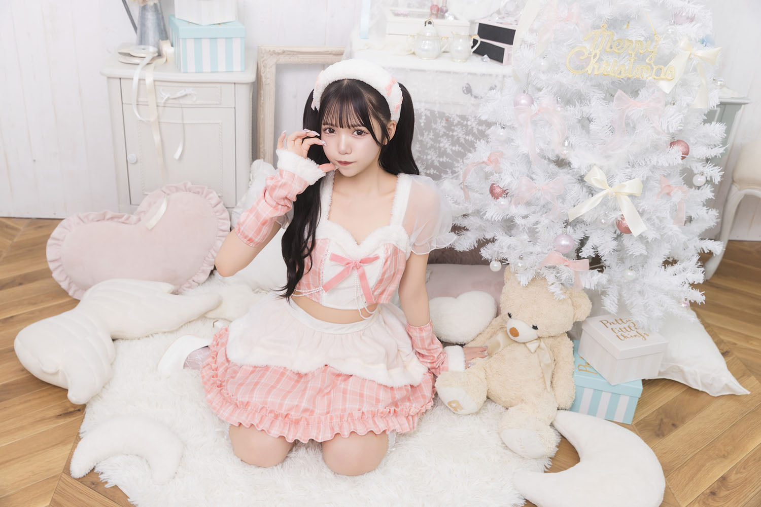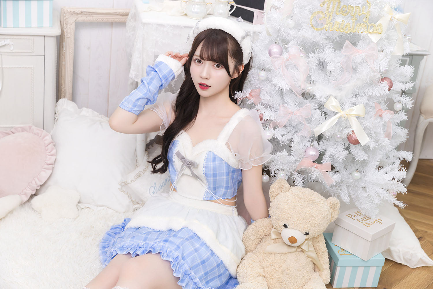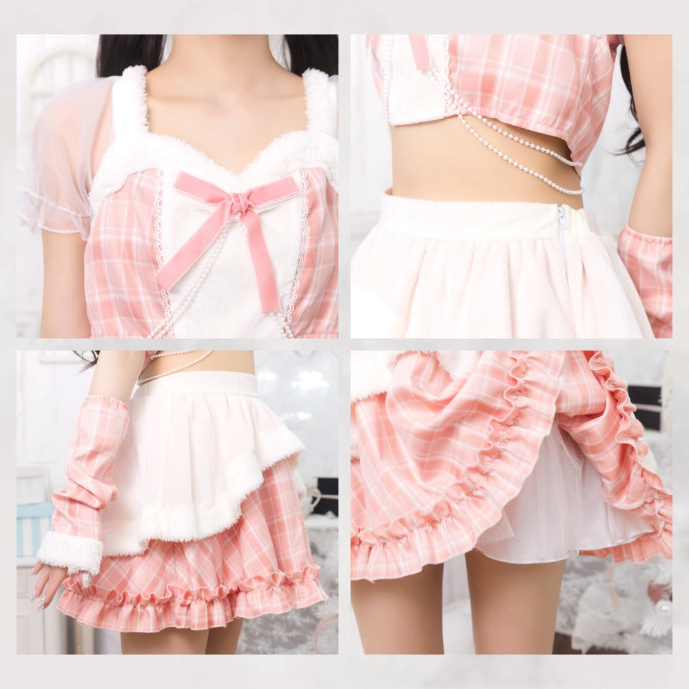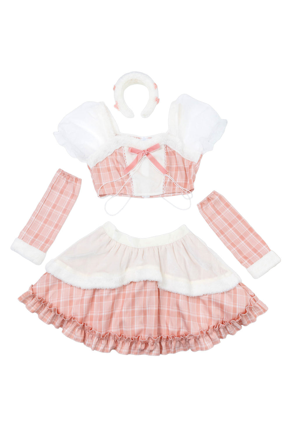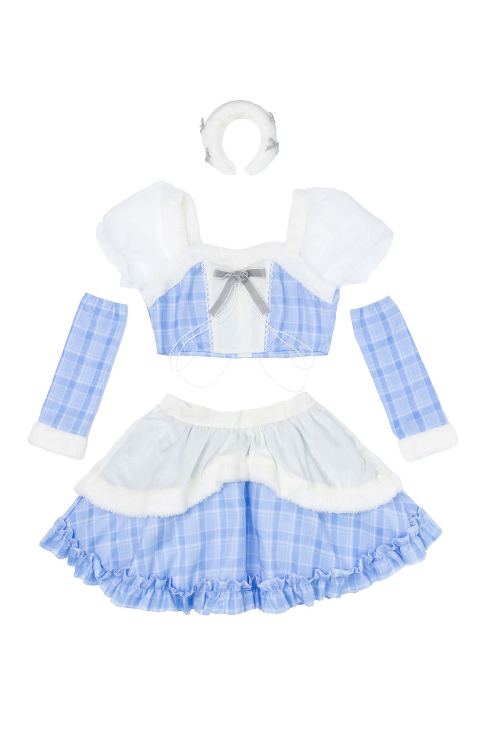 ぷっくりモコモコのカチューシャで顔まわりも華やかに。 大きく透けるパフスリーブと胸元のリボンで女の子らしくキュートなデザイン。 チラっと見えるウエストに垂れるパールが密かなポイント。 パステルカラーのチェック柄と白いファーで冬を明るく楽しめます。 パニエ内蔵なので、中のチュールを広げるとふわっと広がります。 |