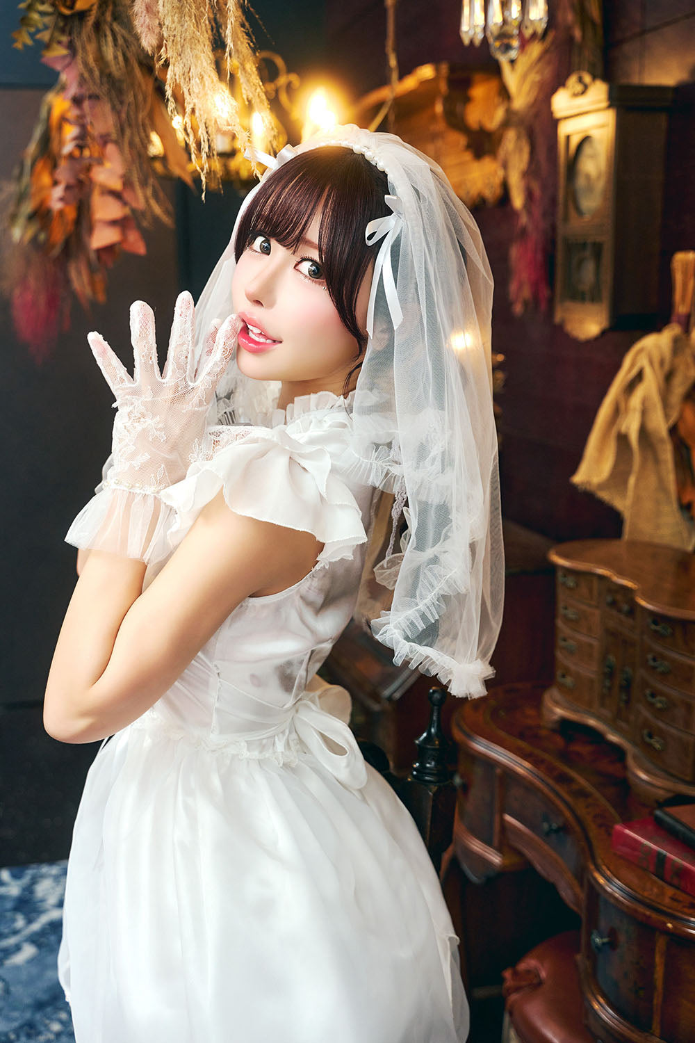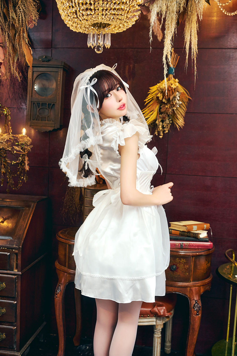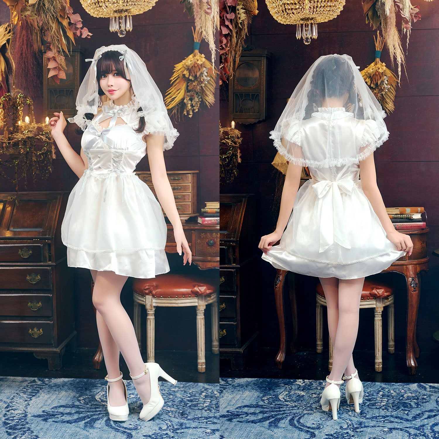 ベール付きカチューシャにはパールをあしらい、エレガントなアクセントをプラス。 胸パッド入りのしっかりとした作りで美しいシルエットを演出します。 袖はふんわりとしたシフォン素材の二重フリル仕様で、フェミニンな印象に。 スカート部分には透け感のあるオーガンジーを重ね、可愛らしさを際立たせました。 ウエスト部分にはレースアップの装飾を施し、後ろのリボンで結ぶことでメリハリのあるシルエットに。 差し色として薄いグレーを取り入れ、洗練された印象に仕上げています。 撮影会やコスプレイベントで映えるシルエットで、軽やかな着心地が女性らしさを引き立てます。 |