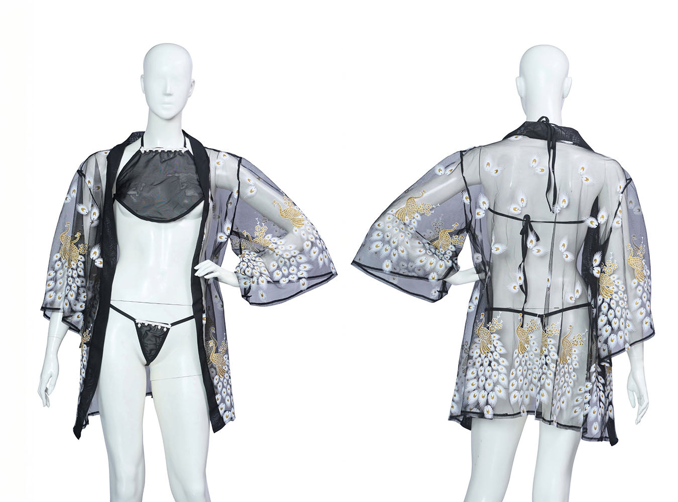 日本が誇る和の文化を落とし込んだ妖艶なコスチューム、艶狐。透明感のある黒のシースルー素材に、孔雀羽根をモチーフとした艶やかなプリントを重ねた、気品と色香をあわせ持つランジェリーセット。