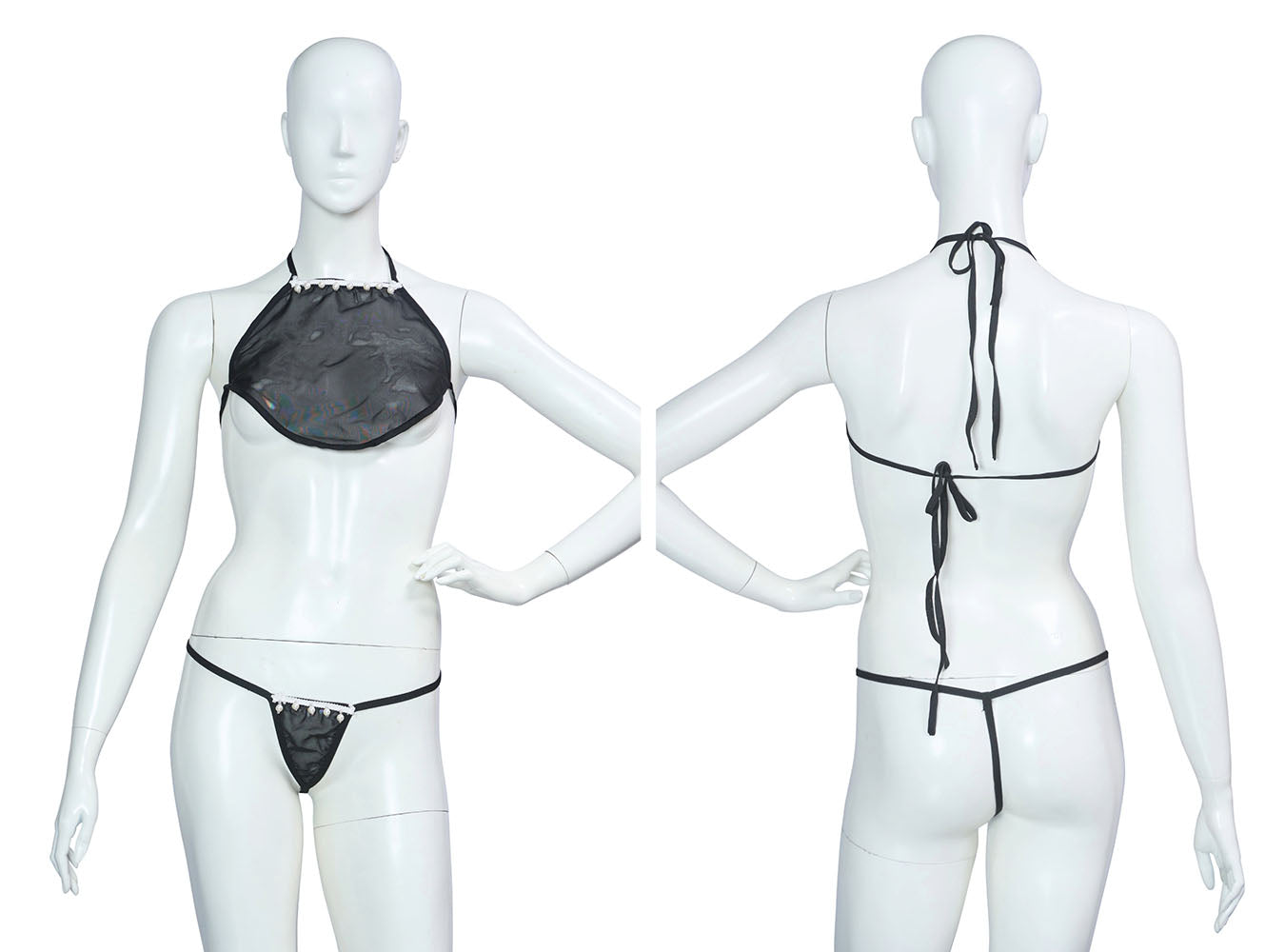 羽織のゴールドの部分はラメプリントになっています。 トップスはホルターネック仕様で、胸元を大胆に透かすことで肌の質感を際立たせ、繊細なフェティッシュ感を演出します。 羽織は袖口や背面にかけて羽根模様が広がり、動くたびに柔らかな流れと奥行きを与えます。 トップスとショーツにあしらったパール飾りがポイントです。 |
